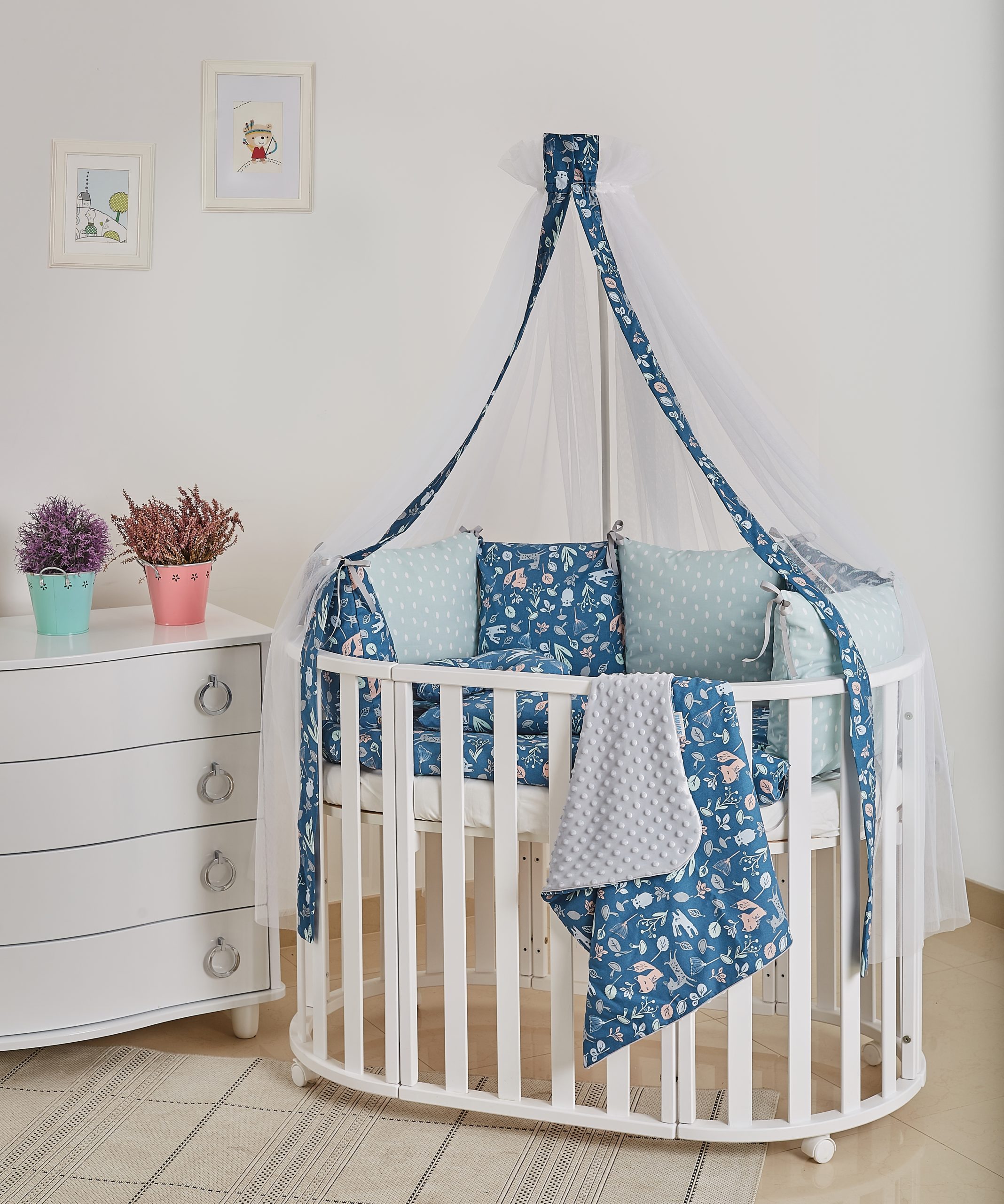 Материал основных элементов комплекта – миткаль; балдахин – миткаль и вуаль. Внимание! В комплект не входит держатель для балдахина. Комплект подходит для детской кроватки с размером спального места 120*60 см, а также детских кроваток круглой конструкции.