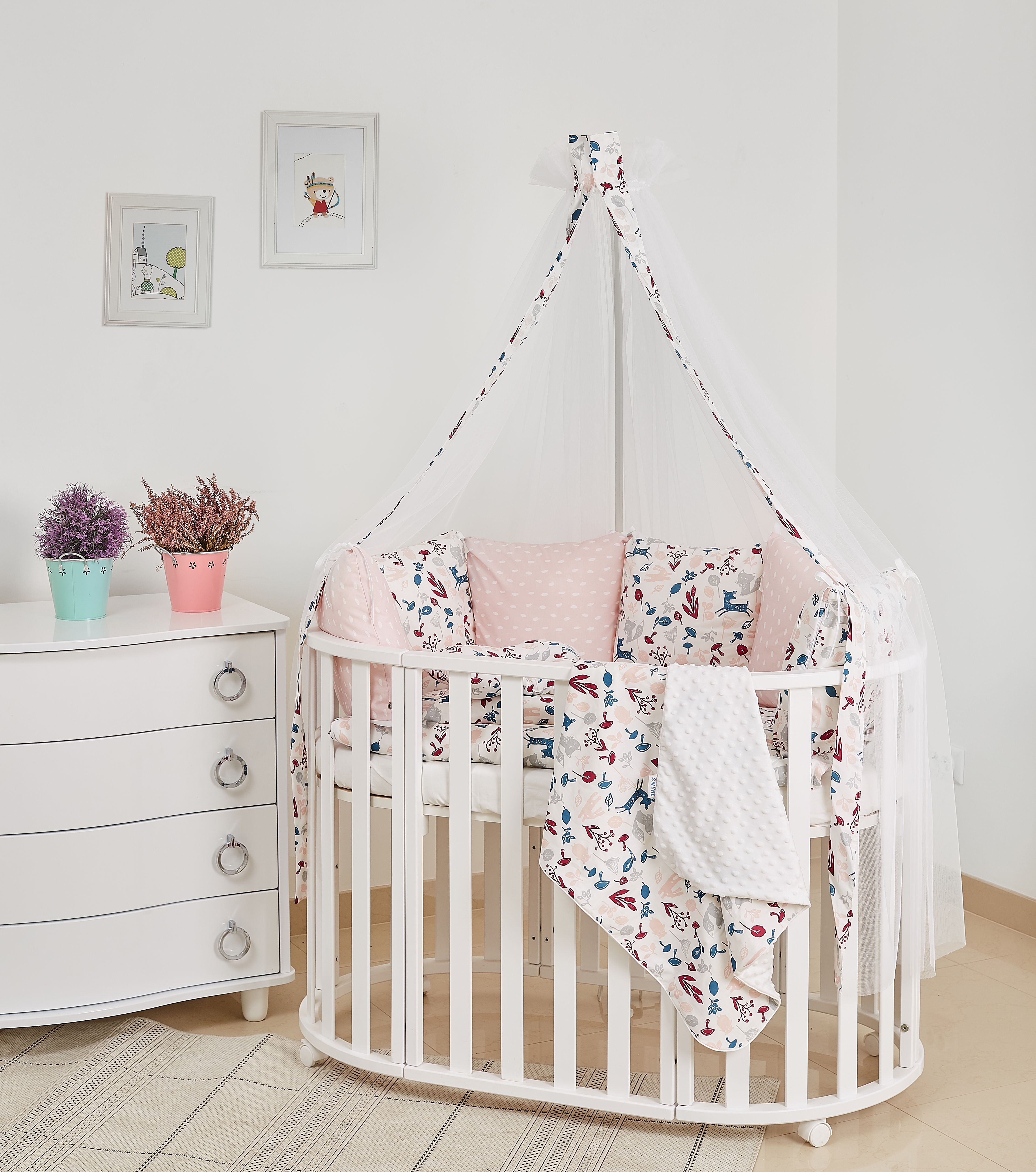 Материал основных элементов комплекта – миткаль; балдахин – миткаль и вуаль. Внимание! В комплект не входит держатель для балдахина. Комплект подходит для детской кроватки с размером спального места 120*60 см, а также детских кроваток круглой конструкции.