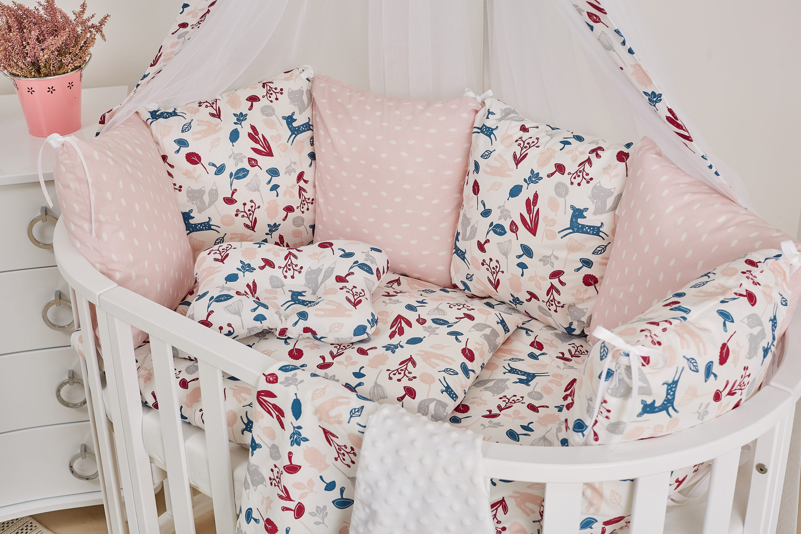 Материал основных элементов комплекта – миткаль; балдахин – миткаль и вуаль. Внимание! В комплект не входит держатель для балдахина. Комплект подходит для детской кроватки с размером спального места 120*60 см, а также детских кроваток круглой конструкции.