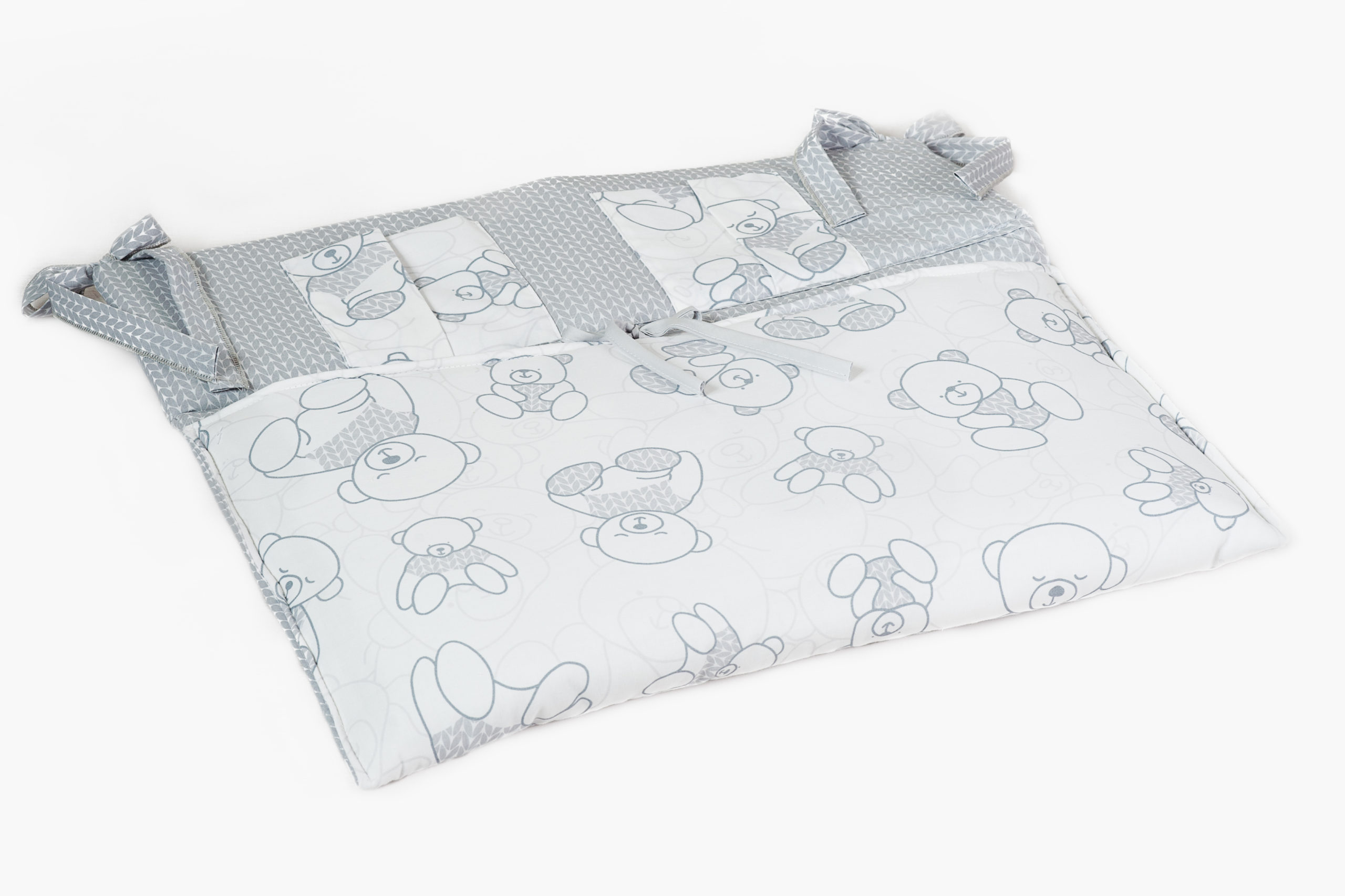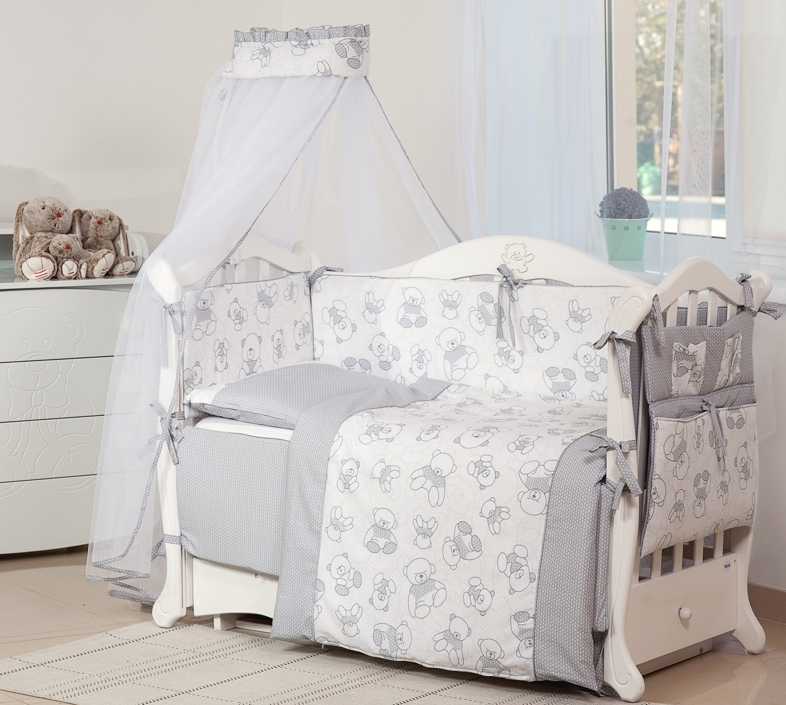 В комплект входит все необходимое. К тому же, все элементы гармонично подобраны по цветовой гамме. Уютный детский постельный комплект Twins Dolce нежно и органично смотрится в любой кроватке. Утонченный балдахин чудесно гармонирует к комплекту, также имеет защитную функцию от насекомых. Держатель для балдахина в комплект не входит. В большой практической кармане удобно хранить необходимые предметы, которые могут понадобиться для ухода за ребенком ночью. Двусторонний бампер закрывает детскую кроватку по периметру, а также защищает от прямых сквозняков, ударов во время сна и игр в кроватке. Поскольку бампер состоит из 3-х частей, по мере роста малыша, вы можете открывать нужные для мамы части кровати, убирая бортики. Чехлы съемные на молнии. Наполнитель бортиков - поролон.