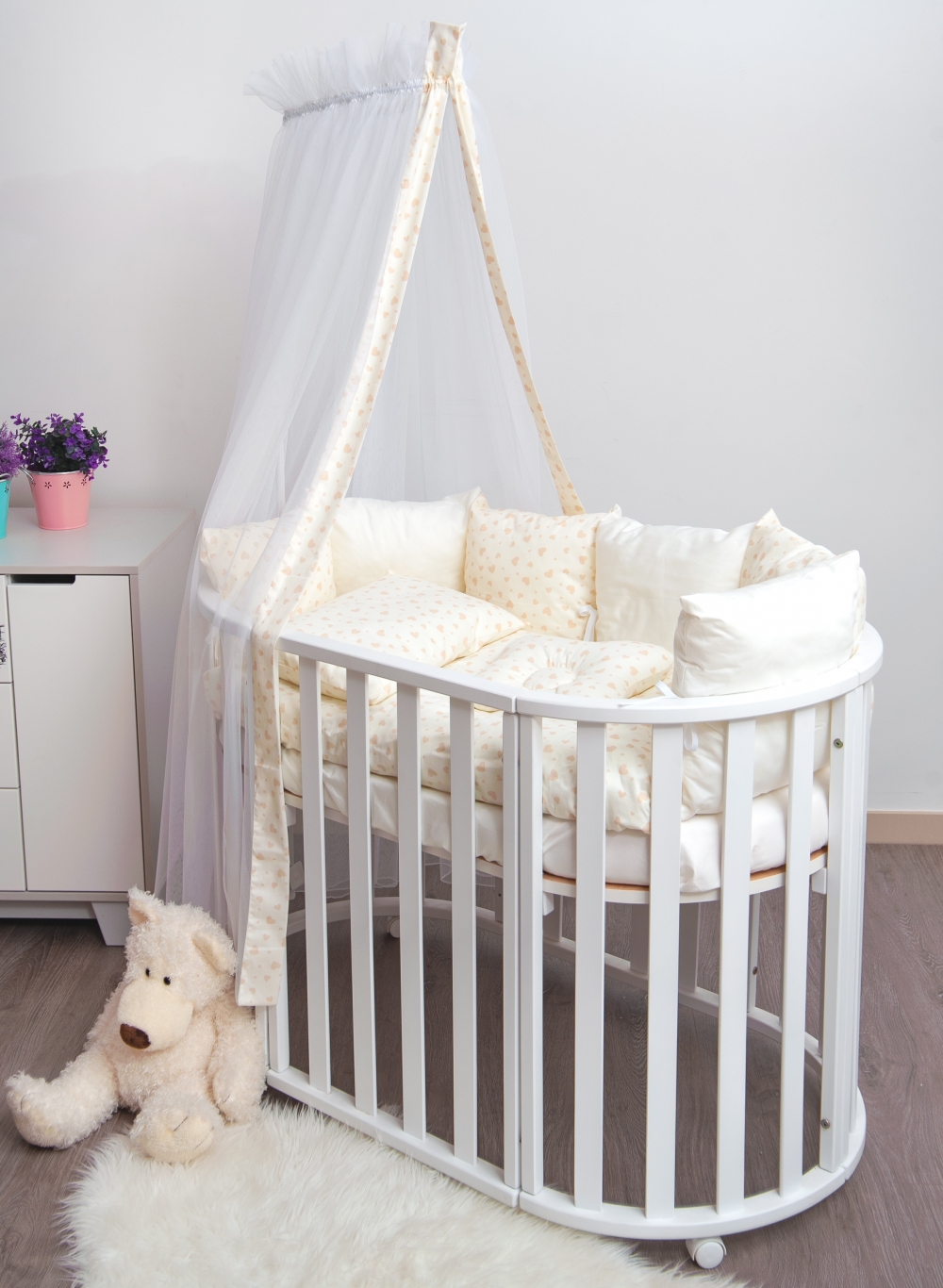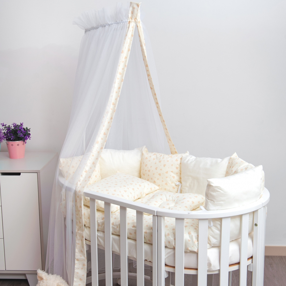 Материал основных элементов комплекта – сатин; балдахин – сатин и вуаль. Внимание! В комплект не входит держатель для балдахина. Комплект подходит для детской кроватки с размером спального места 120*60 см, а также детских кроваток круглой конструкции.