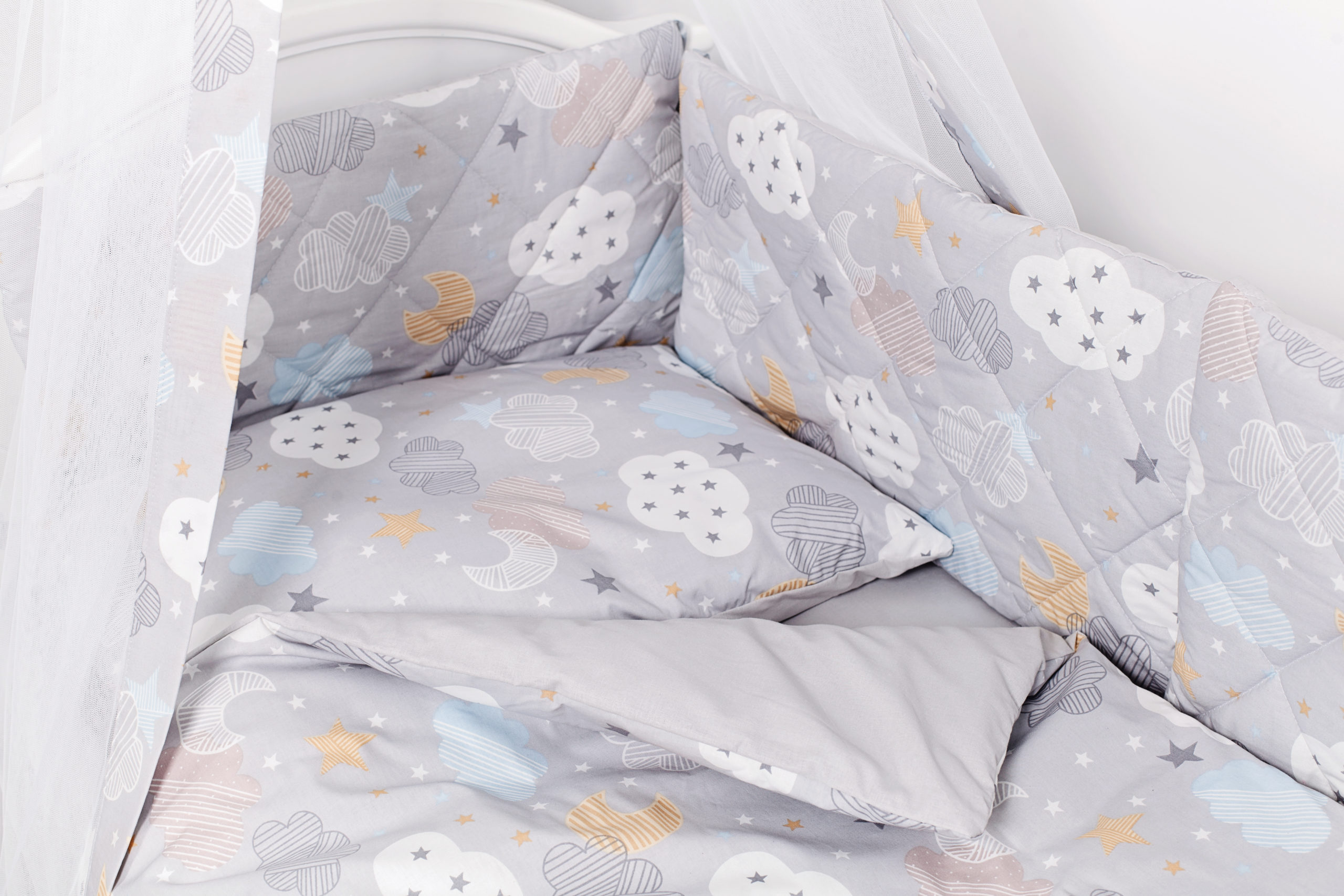 В навесной кармане удобно хранить необходимые мелочи, которые могут понадобиться ребенку ночью. Двусторонний бампер защищает от прямых сквозняков, ударов во время сна и игр в кроватке. Три завязки вдоль бампера позволяют привязывать игрушки из музыкального мобиля, дополняя при этом комплект яркими элементами и развлекая малыша. Бортики стеганые без замка.