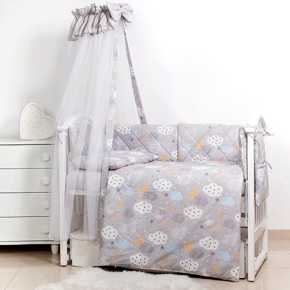 Twins Premium Glamour — это гипоаллергенная ткань и наполнитель, безопасная конструкция и удобное использование. В комплект входит все необходимое. К тому же, все элементы гармонично подобраны по цветовой гамме. Балдахин с узором чудесно гармонирует в комплект также защитную функцию от насекомых, которые могут залететь в детскую комнату.