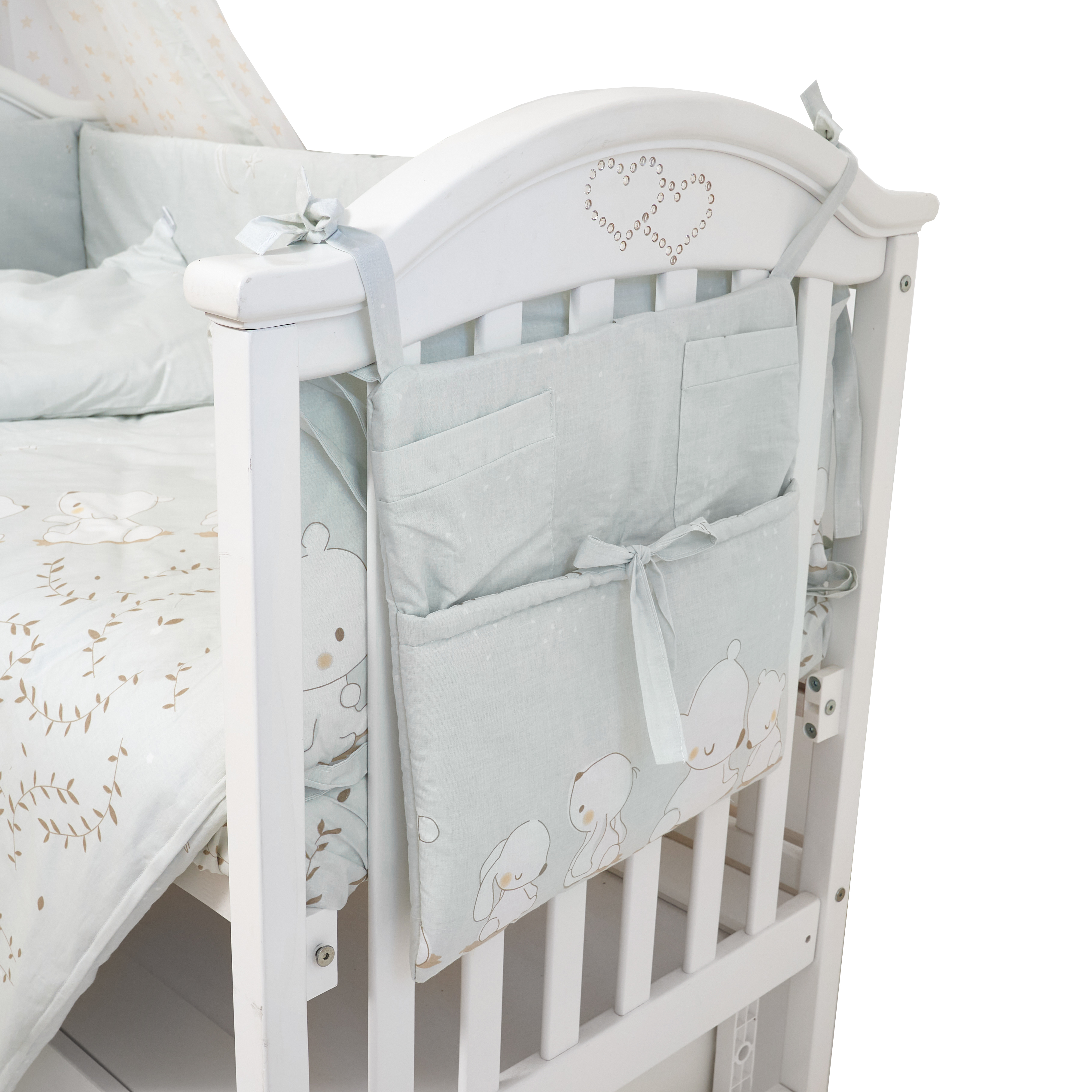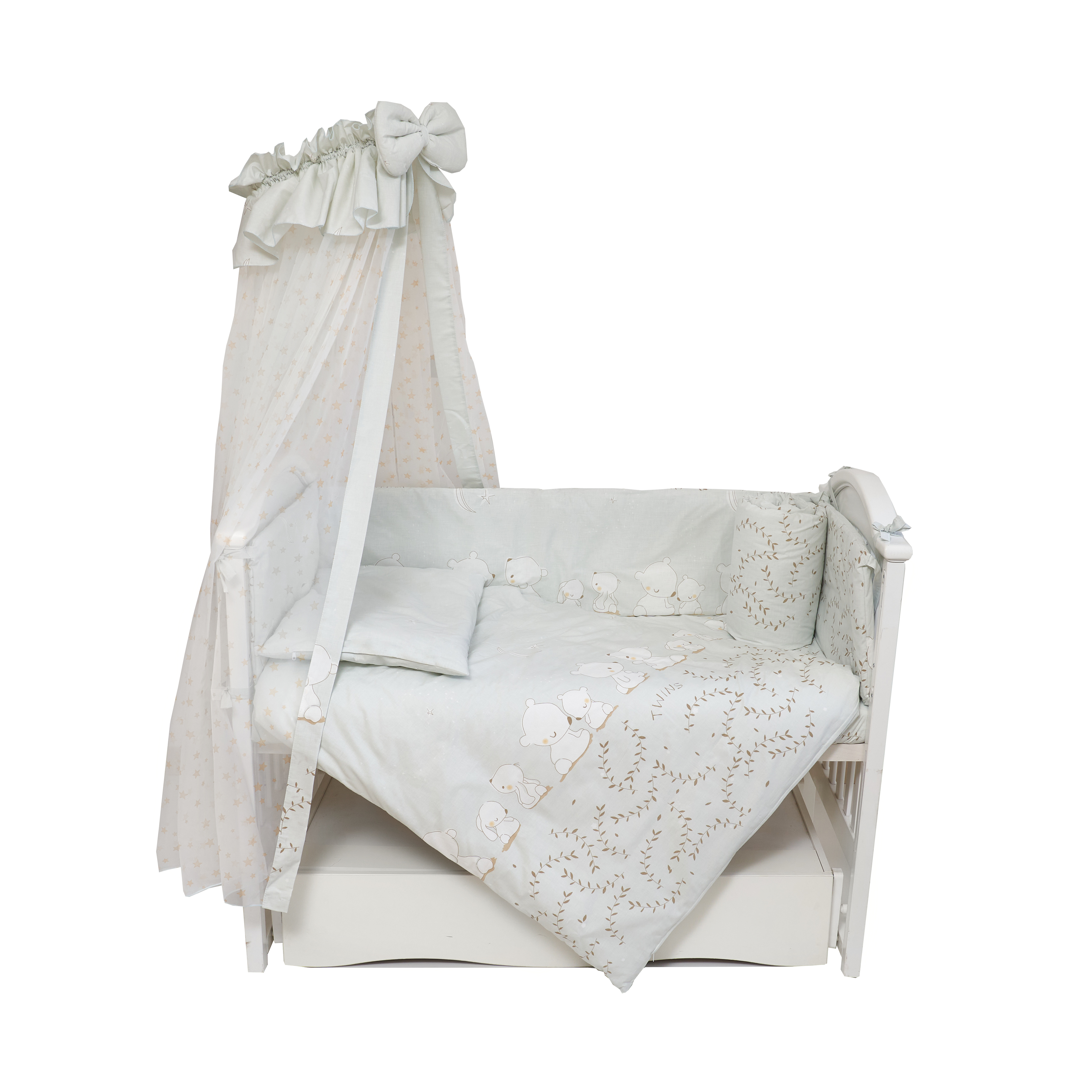 Набор подходит для стандартной детской кроватки размером 120×60 см и включает все необходимые элементы для безопасного и уютного сна новорожденного.