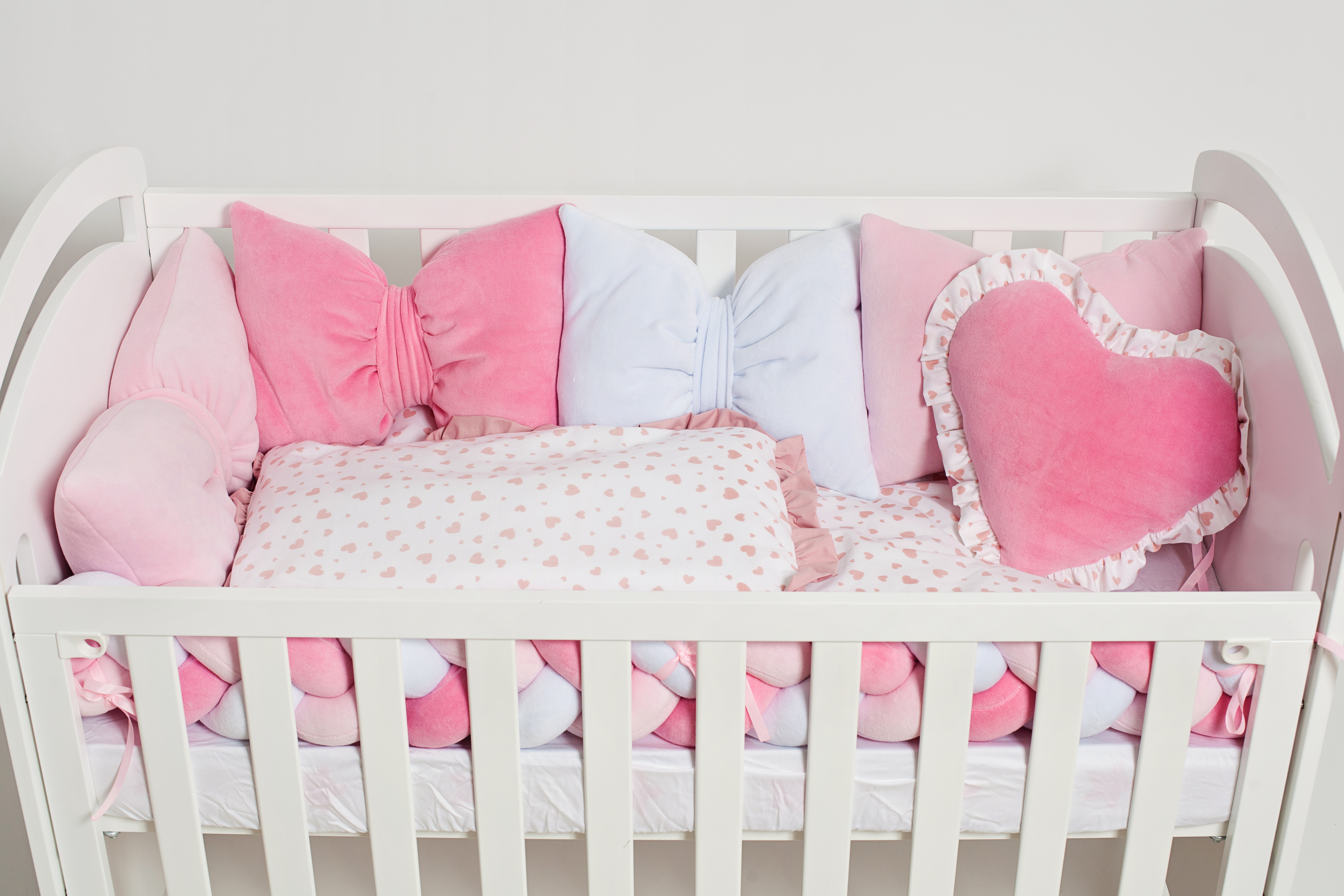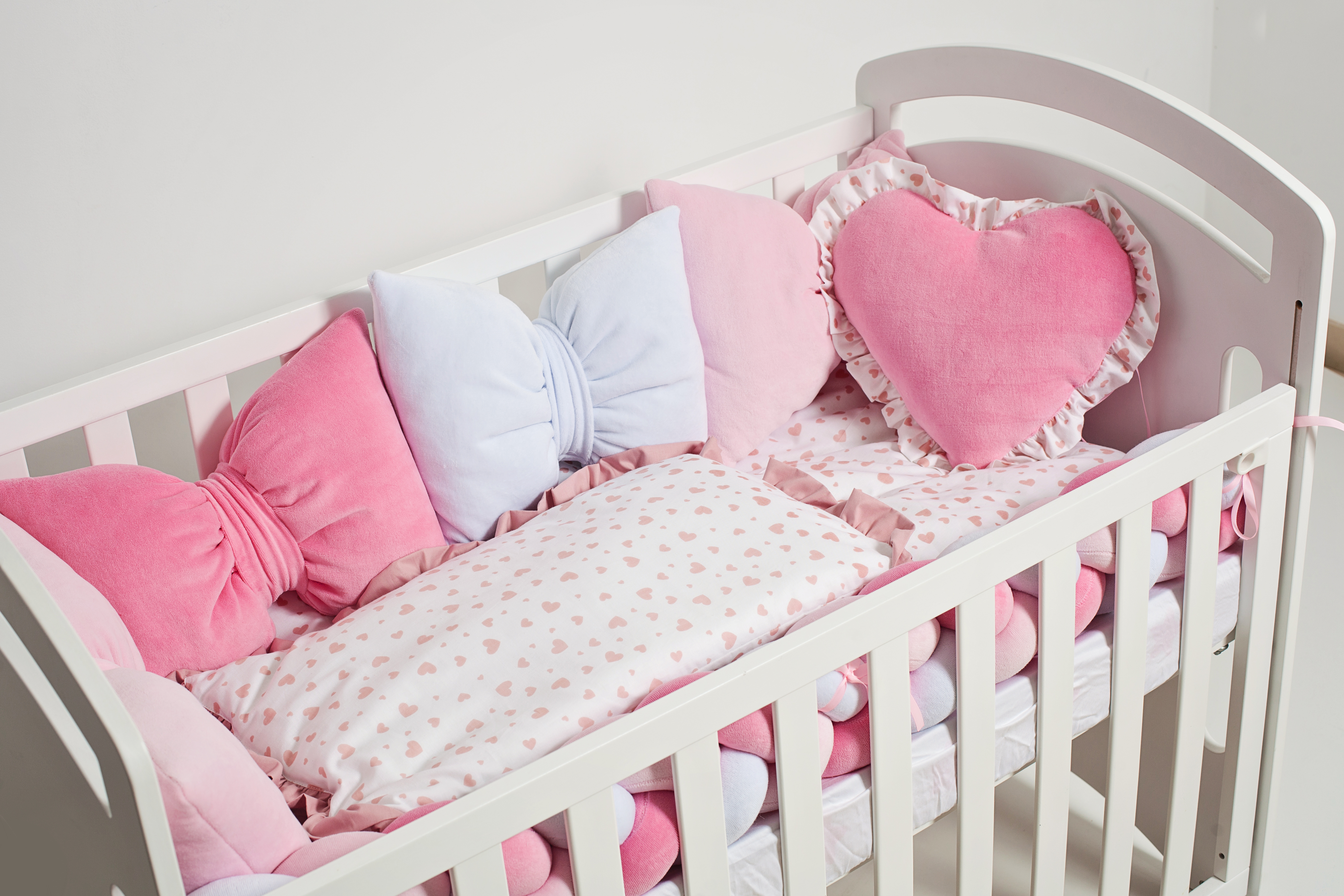Нежный постельный комплект для младенцев создаст прекрасную атмосферу в детской комнате. Подходит для кроватки 120х60 см. Комплект изготовлен из натурального хлопка и велюра, приятный на ощупь и нежный к коже малыша. Бортики в виде подушек и косы защитят малыша от сквозняков и ударов о перила кроватки. Подушки-бантики можно использовать как обычные подушки, если снять перепонки. Они крепятся к кровати завязками. Простыня на резинке, поэтому ее не нужно поправлять каждый раз. Подушки декорированы рюшами.