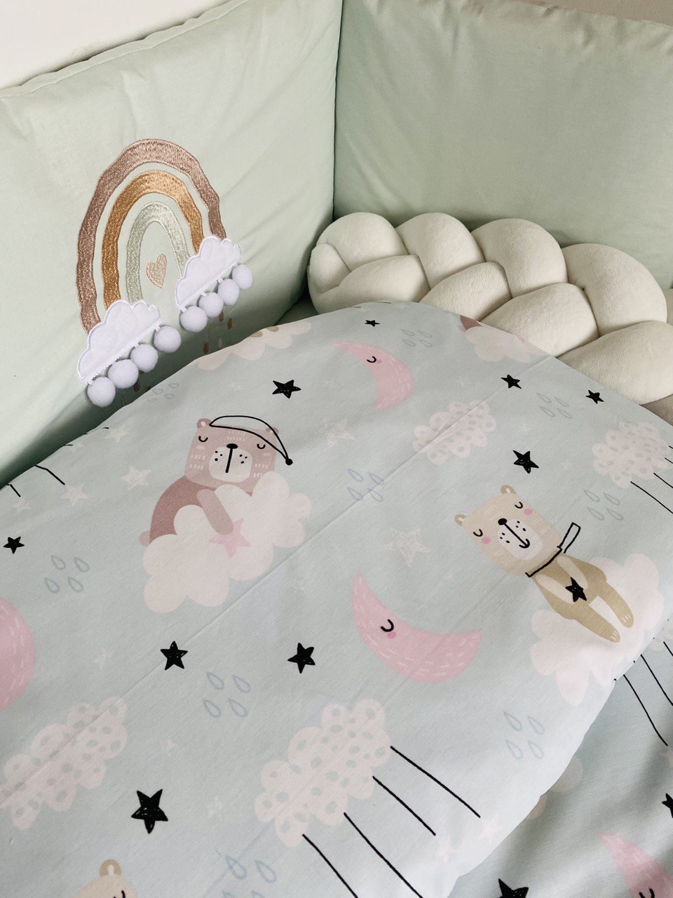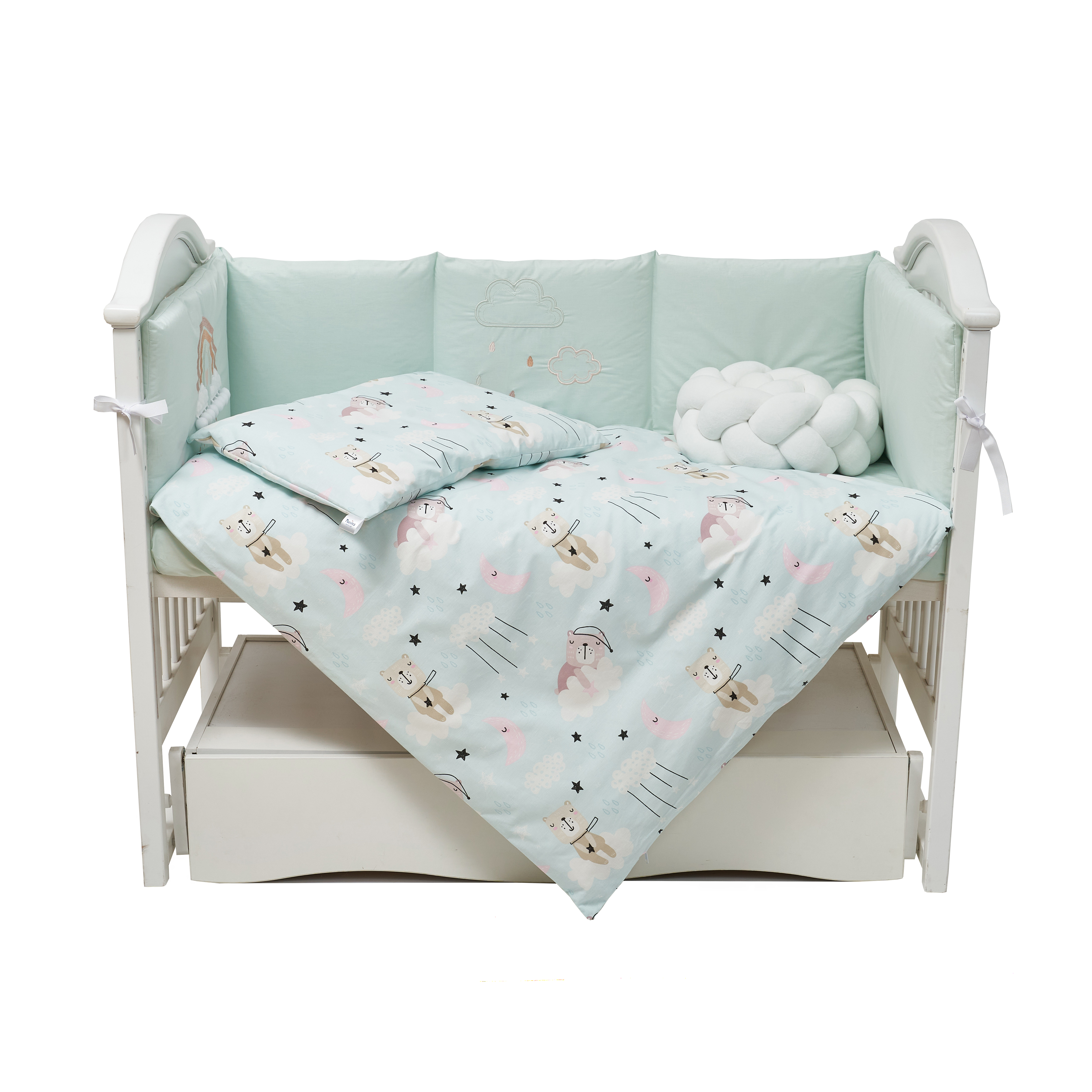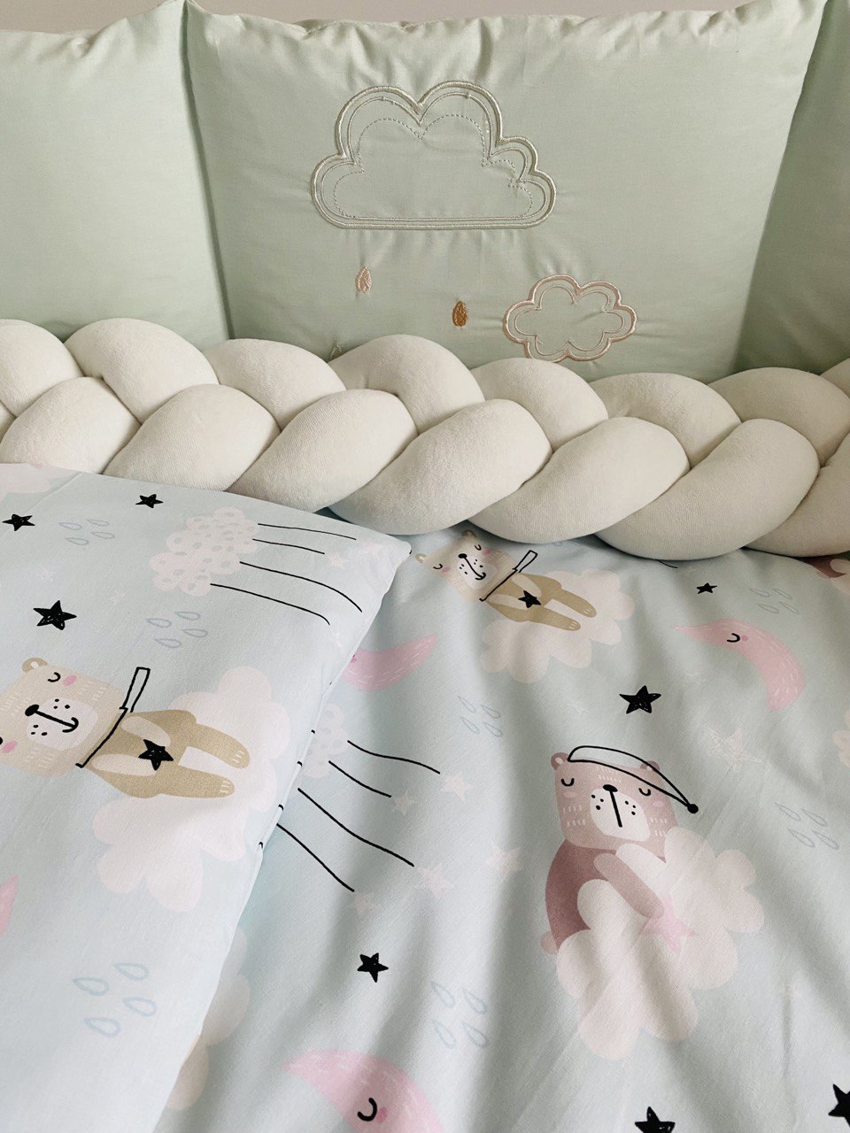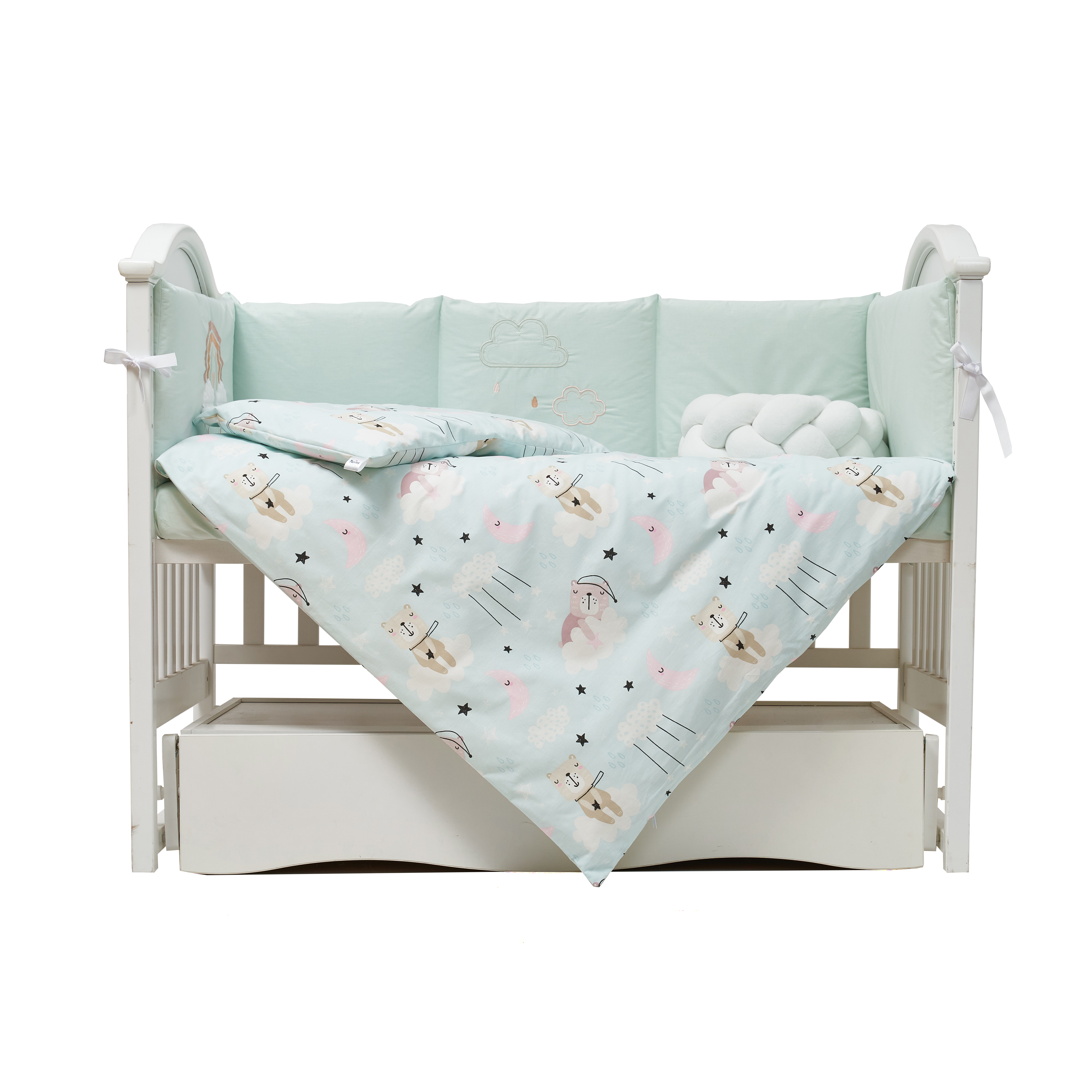 Отдельный элемент набора – декоративная косичка-бампер длиной 120 см, которая дополнительно огораживает кроватку, создавая безопасное пространство для сна.