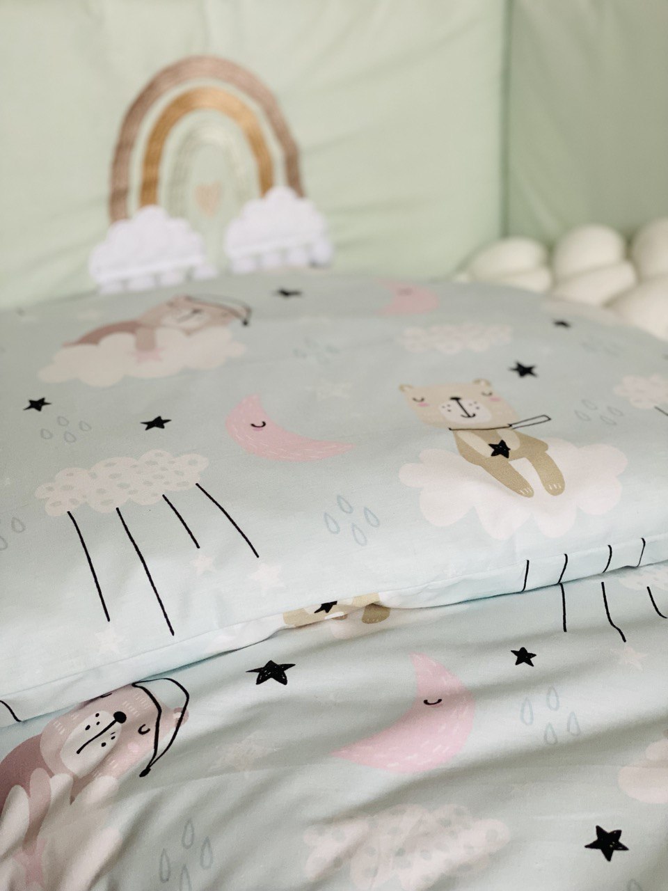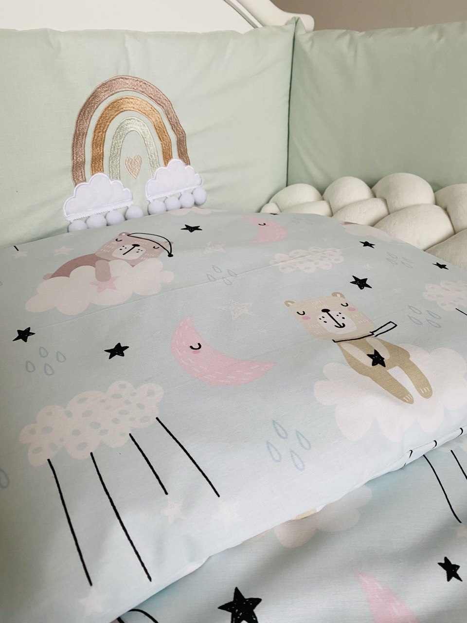 Принт с милыми мишками создает особую атмосферу уюта, а нежная вышивка на бампере добавляет комплекту эстетической привлекательности.