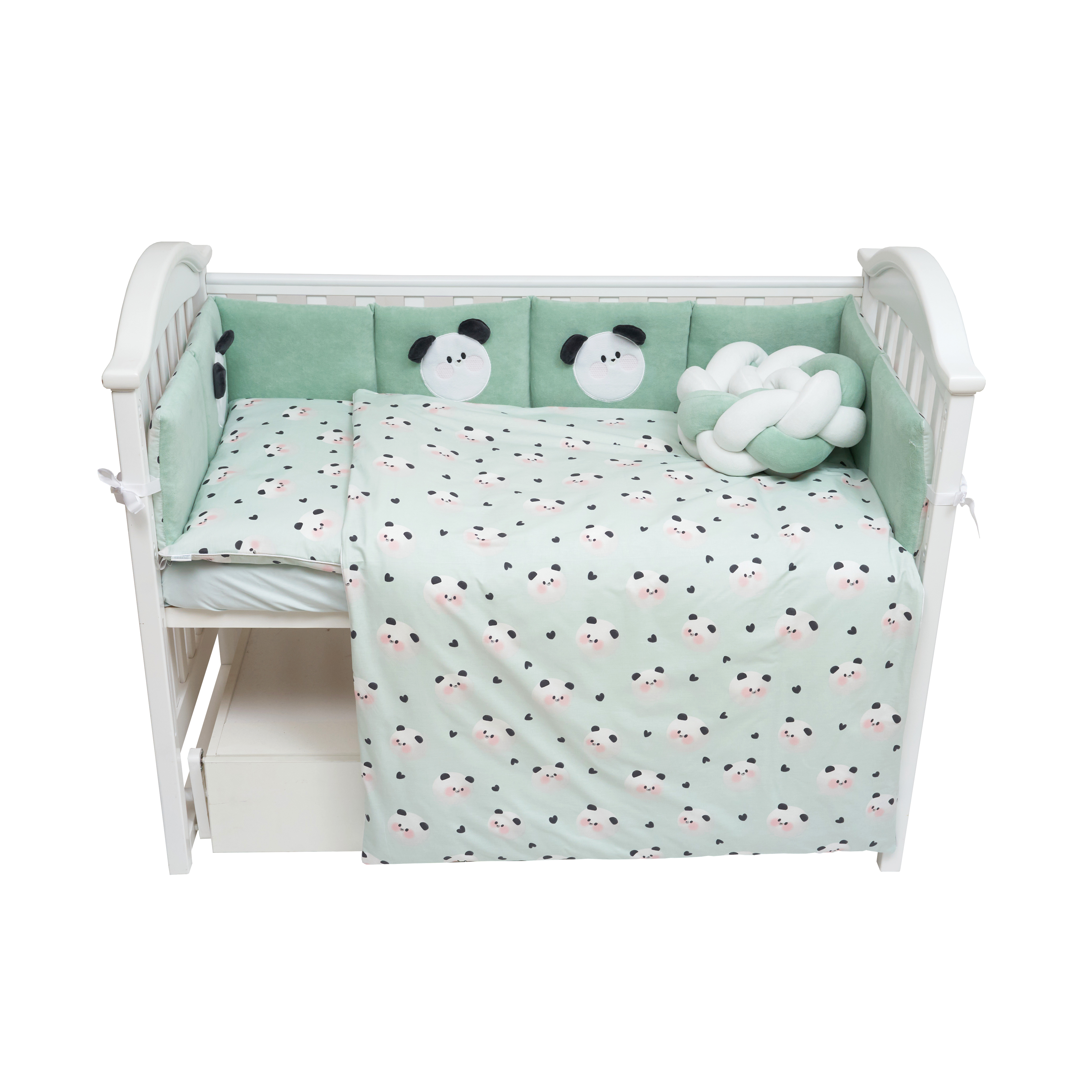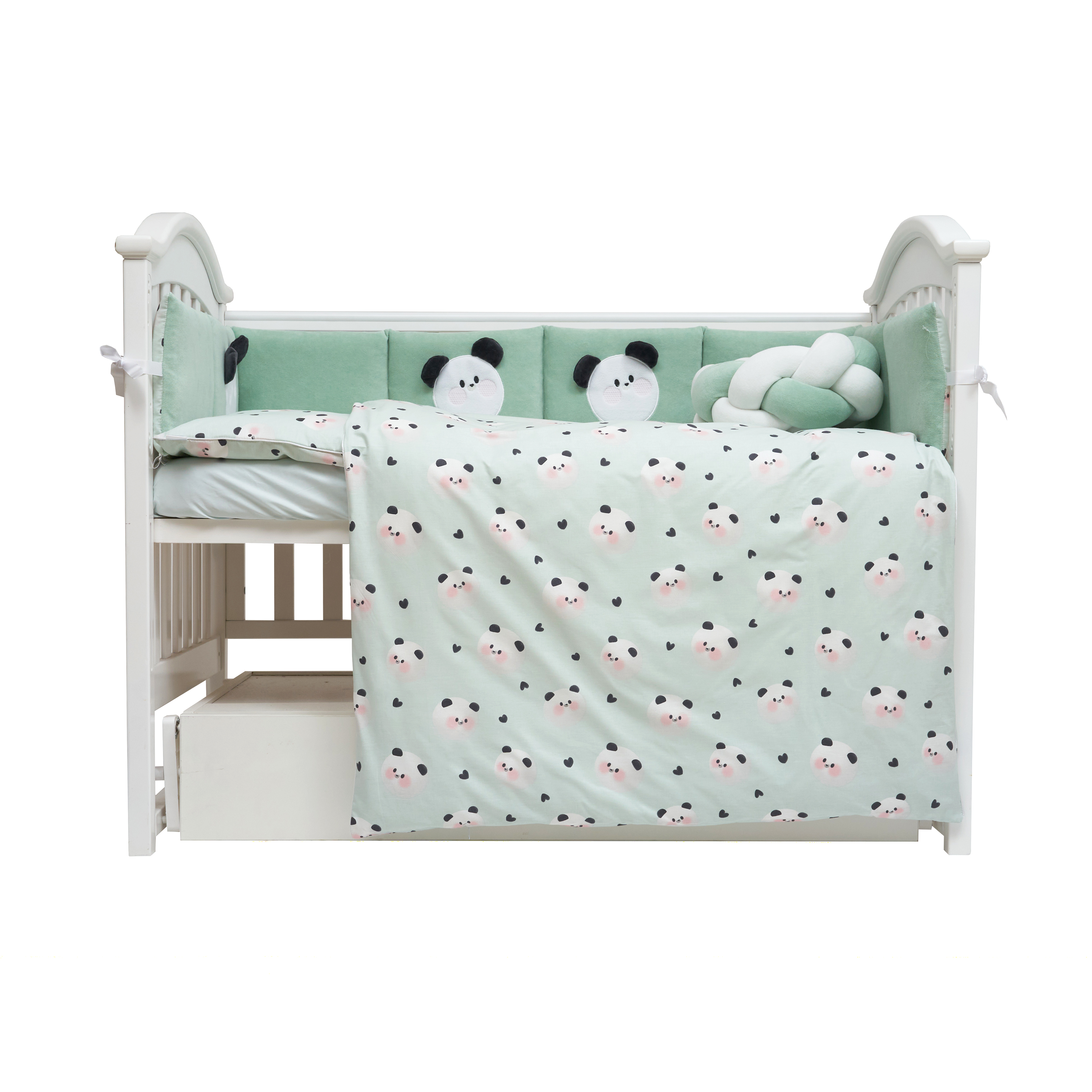 Наш набор создан из гипоаллергенных, дышащих материалов - хлопкового велюра и 100% хлопка, обеспечивающих комфортный и безопасный сон малыша.