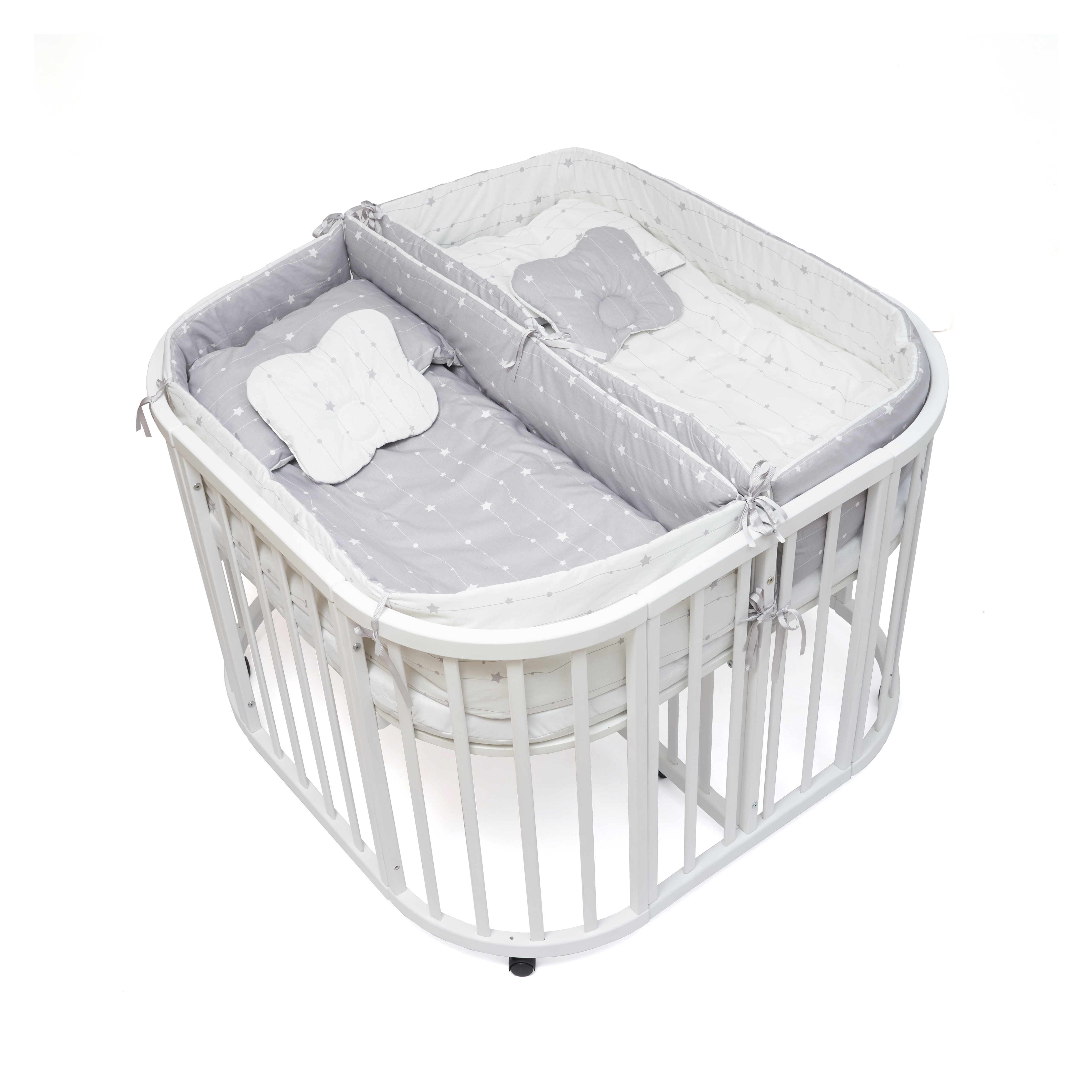 Радость материнства невозможно сравнить с любыми другими эмоциями, а стать родителями двойни ー это счастье умноженное на два. И так, всегда удваиваются и хлопоты, но все же у клиентов компании Twins их немного меньше, ведь они выбирают постель для двойни Starlet grey. Милый дизайн в сочетании с качественной тканью не оставит равнодушными ни мам с папами, ни малышей-двойняшек. Основа комплекта ー 100% хлопок, который безопасен для кожи новорожденных и не провоцирует никаких аллергических реакций. А еще такая ткань не теряет формы и цвета, поэтому мамочки могут быть спокойны на протяжении многократных стирок. Постельный комплект состоит из 14-ти элементов, которые полностью укомплектуют кроватку для обоих малышей. Кроме привычных постельных принадлежностей в комплект входят два бампера, которые дополнительно будут оберегать малышей во время сна.