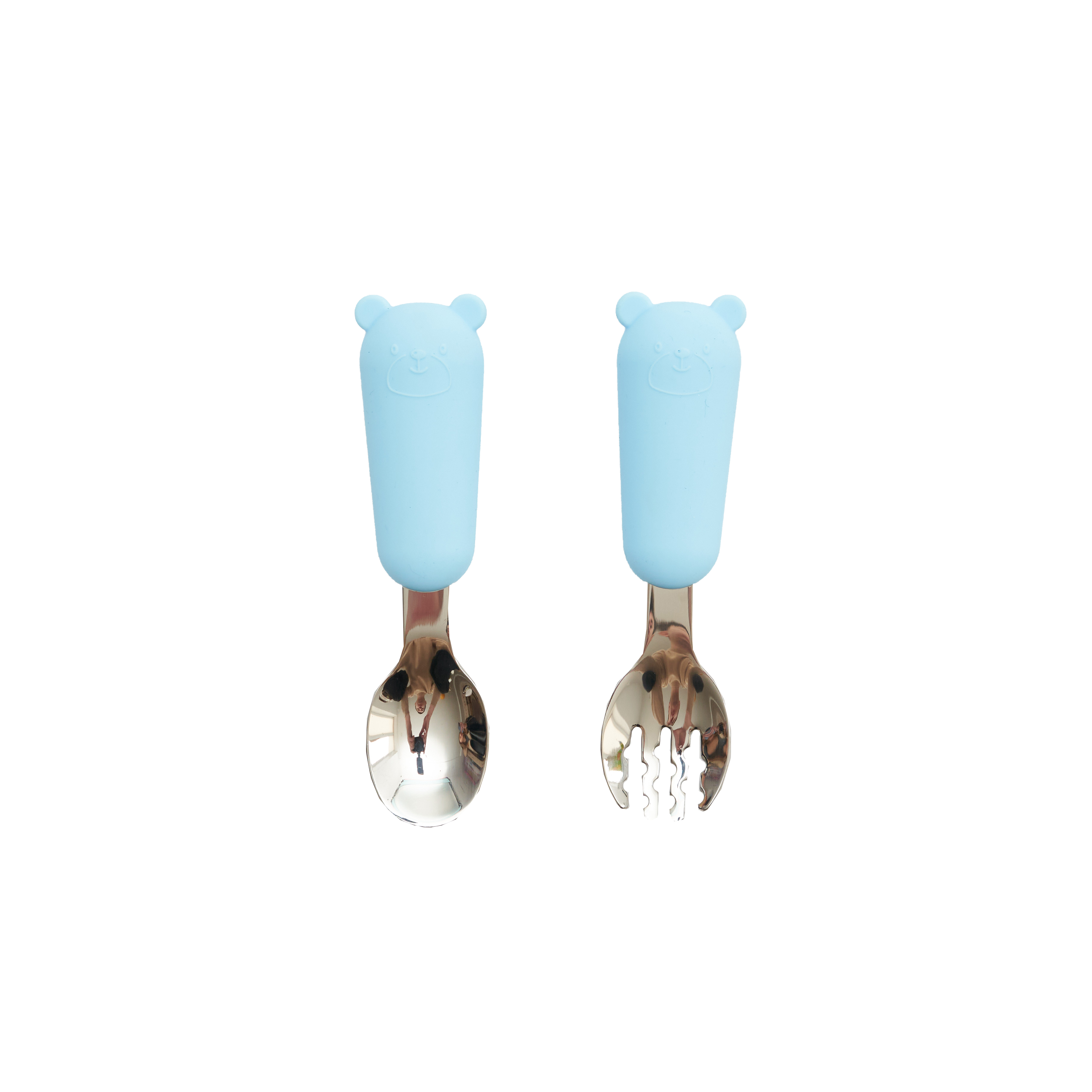 Приборы – ложка и вилка из нержавеющей стали. Приятные на ощупь и безопасные для малышей, форма удобна для обхвата детской ручкой.