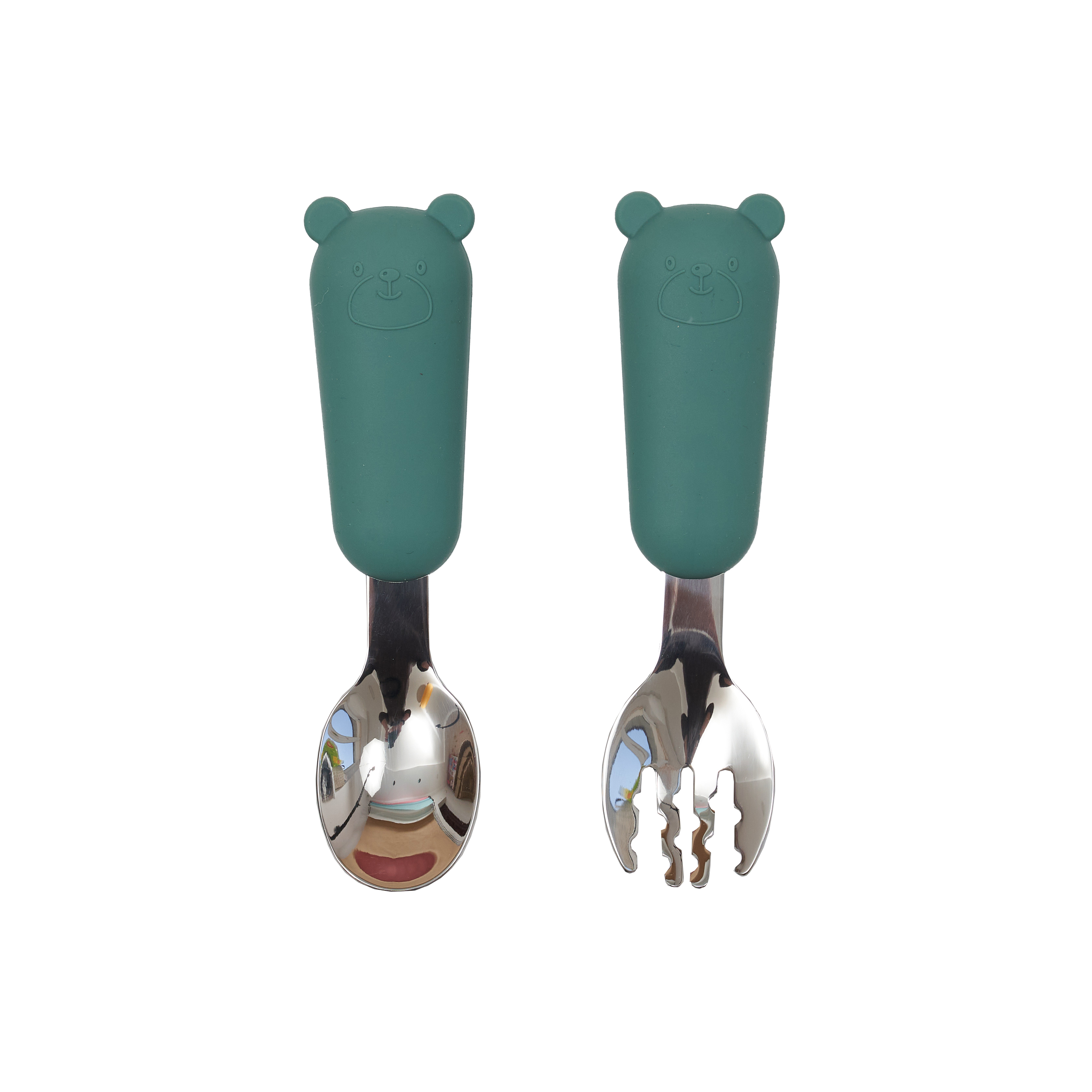 Приборы – ложка и вилка из нержавеющей стали. Приятные на ощупь и безопасные для малышей, форма удобна для обхвата детской ручкой.