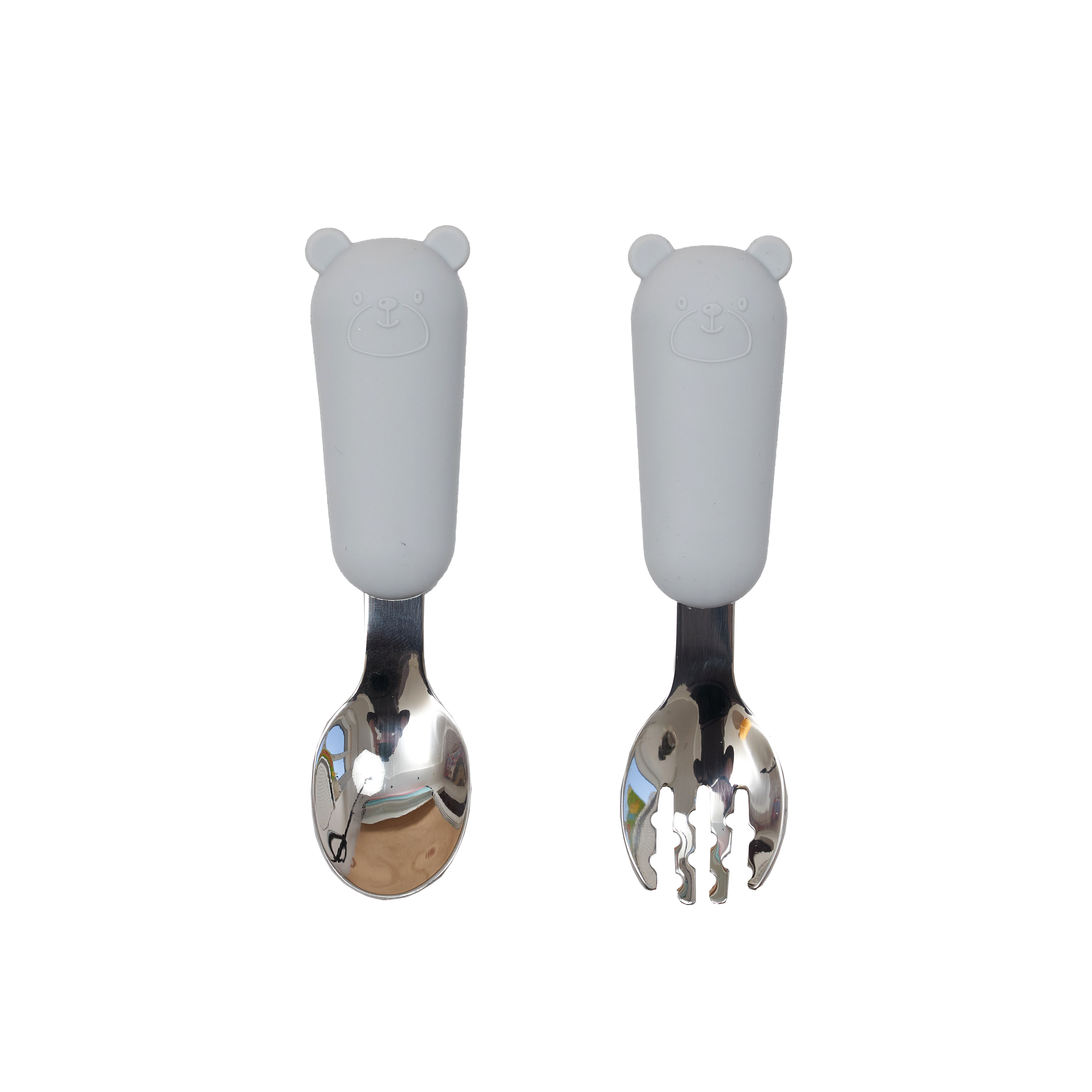 Приборы – ложка и вилка из нержавеющей стали. Приятные на ощупь и безопасные для малышей, форма удобна для обхвата детской ручкой.
