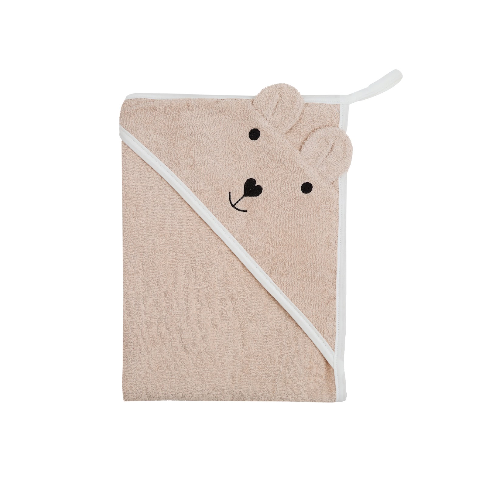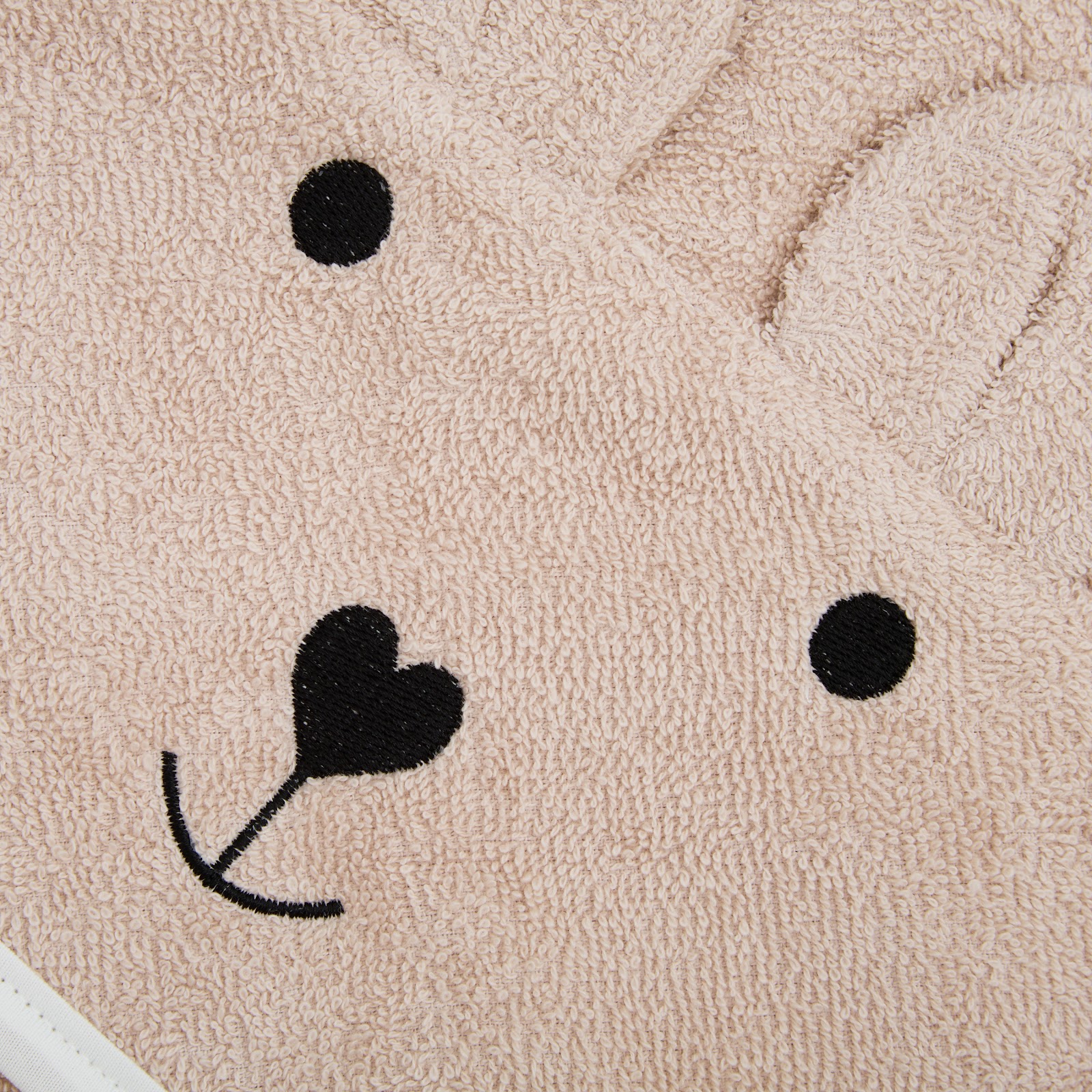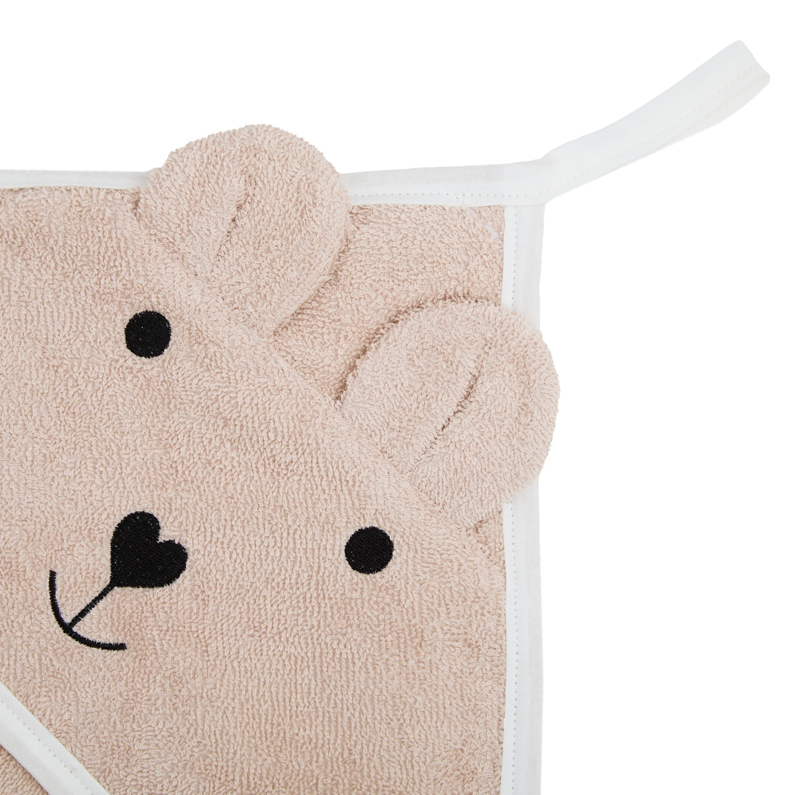 Милый капюшон в форме угла с вышитым личиком мишки и мягкими ушками дарит ребенку комфорт, защищает головку от холода и добавляет положительных эмоций после водных процедур.