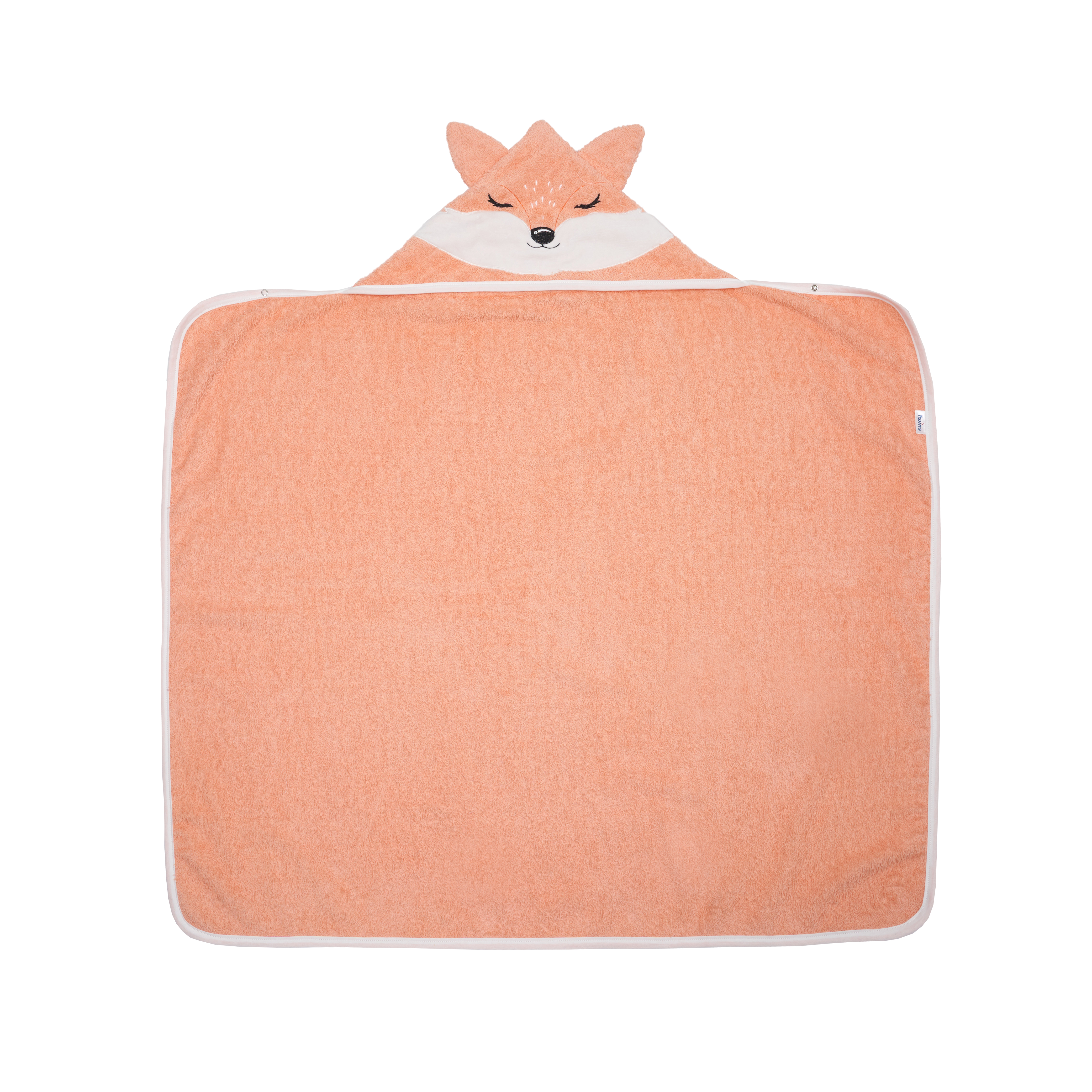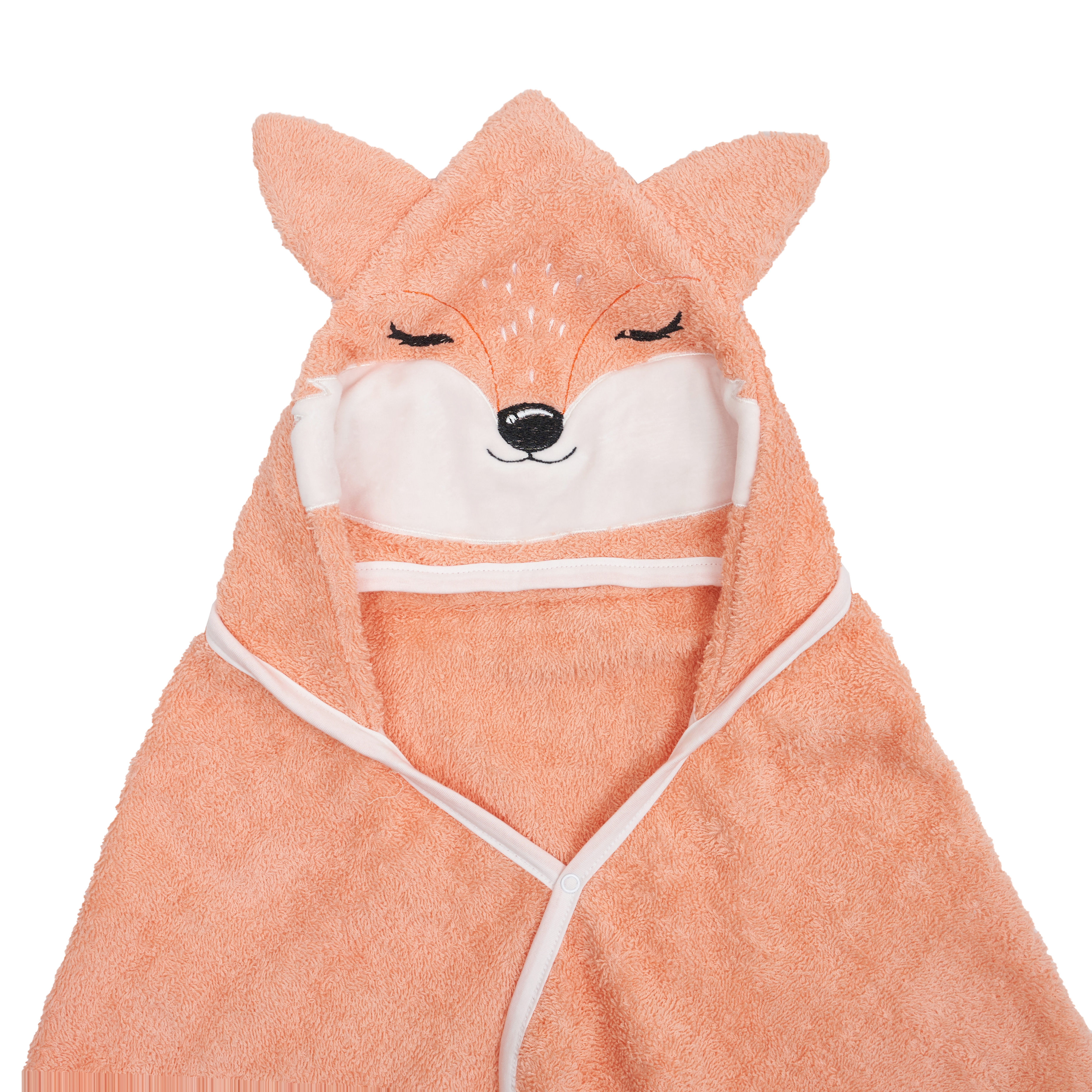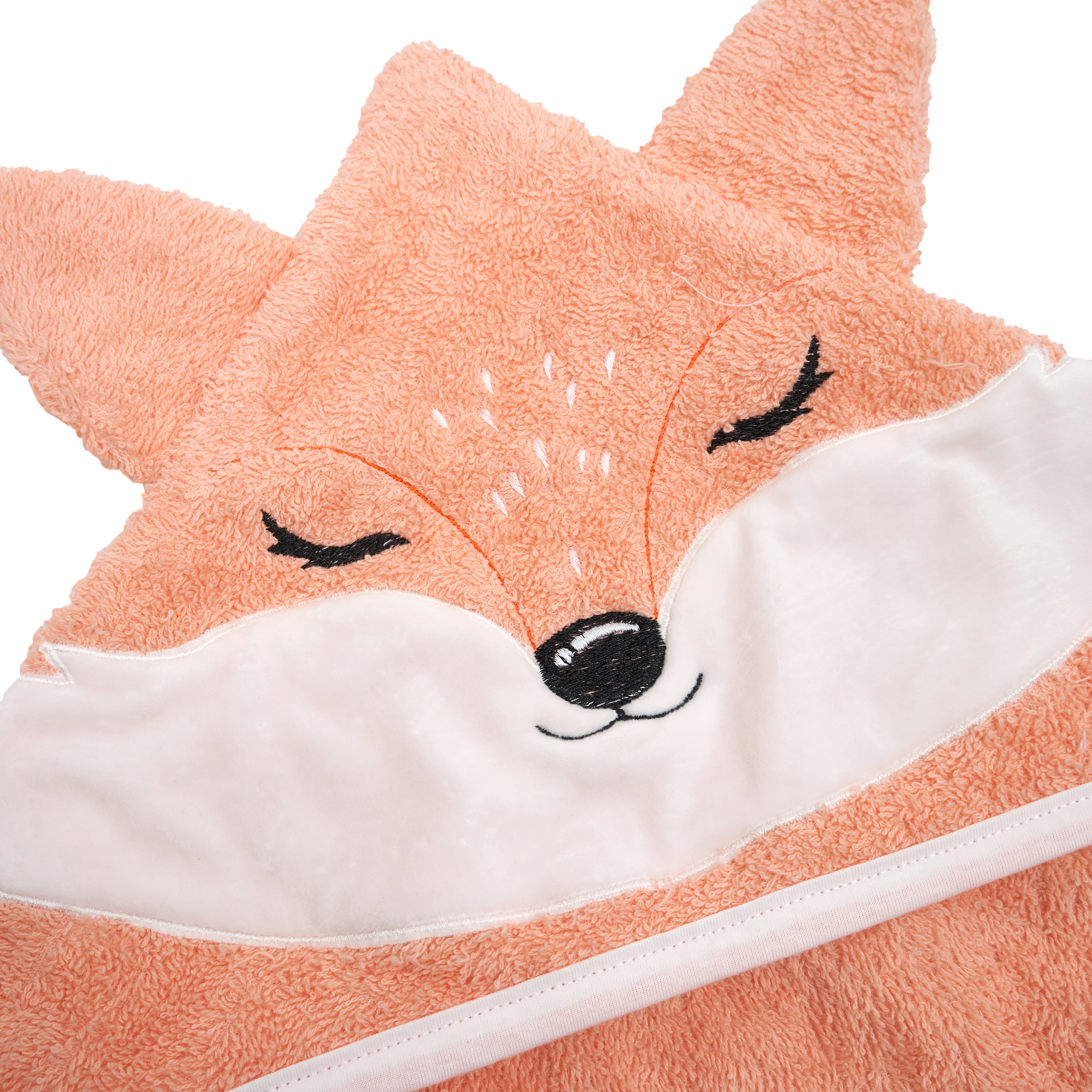 Капюшон в виде уголка украшен милой вышивкой с изображениями животных: лисички, котика, собачки и уточки, что непременно понравится малышу и добавит эмоций во время купания.
