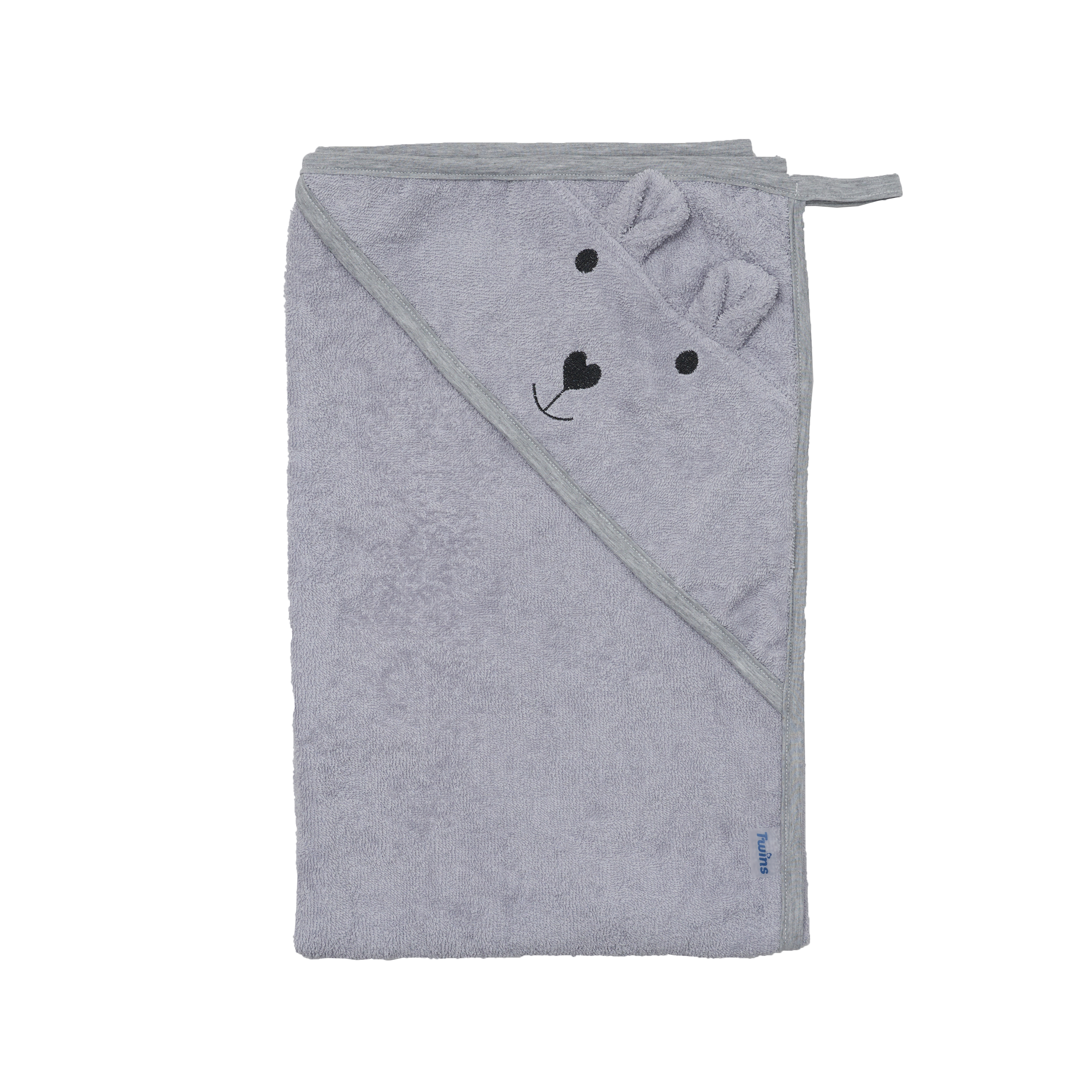 Милый капюшон в форме угла с вышитым личиком мишки и мягкими ушками дарит ребенку комфорт, защищает головку от холода и добавляет положительных эмоций после водных процедур.