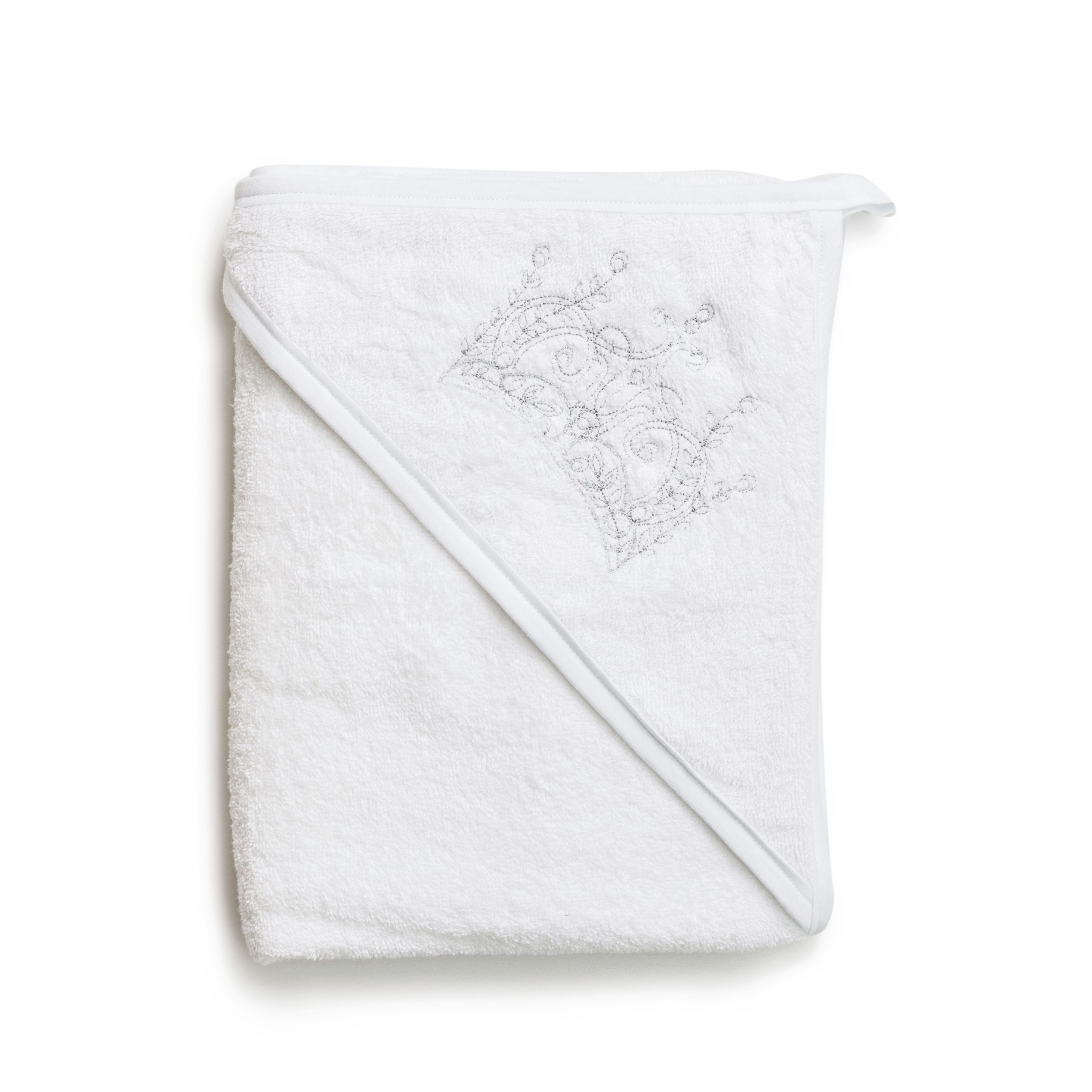 Благодаря капюшону с красивой серебряной вышивкой в виде короны, полотенце не только защищает головку ребенка от сквозняков, но и придает изделию изящный вид.