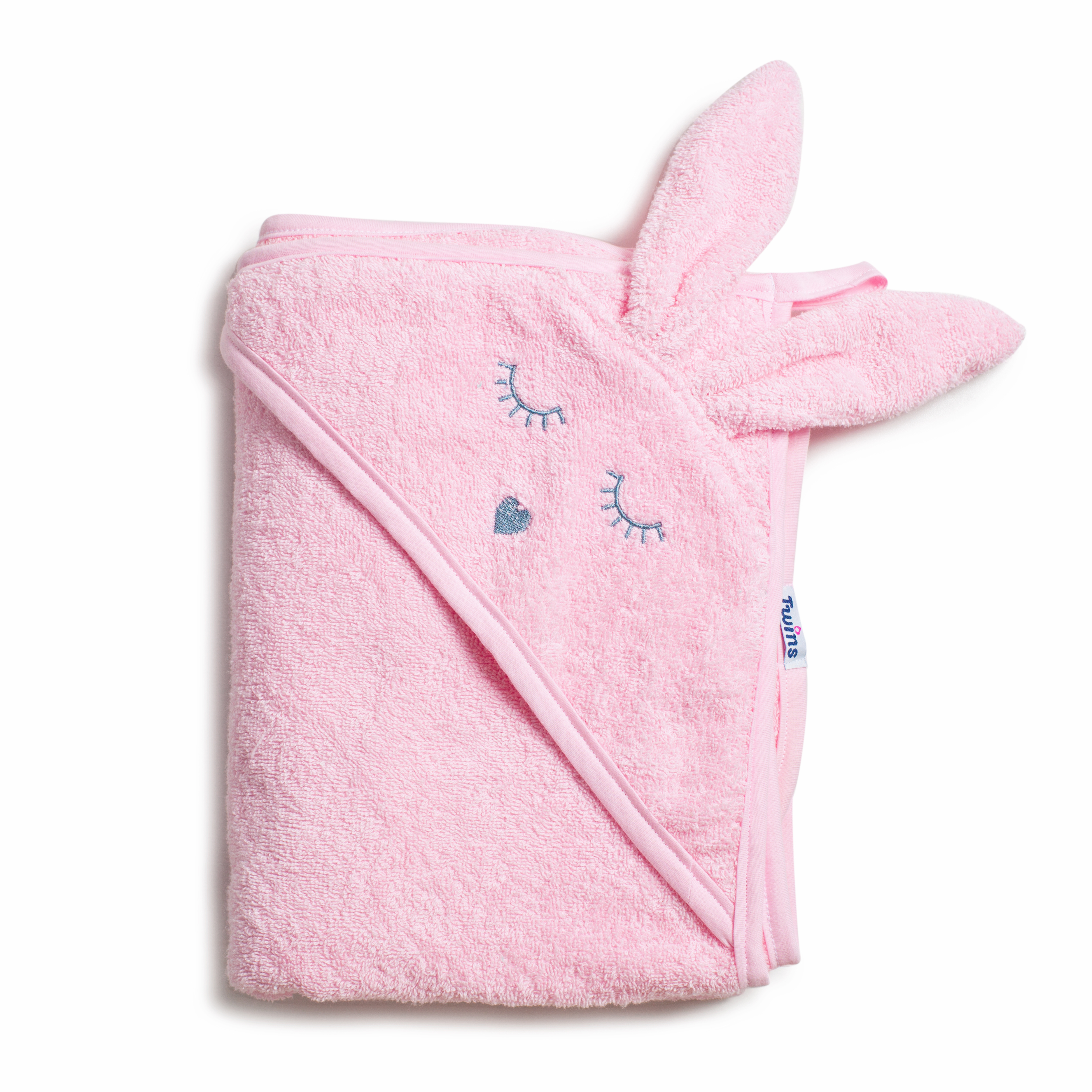Милое махровое детское полотенце Twins Rabbit с уголком, вышитым лицом зайчика и декоративными ушками - настоящее удовольствие для малыша после купания!