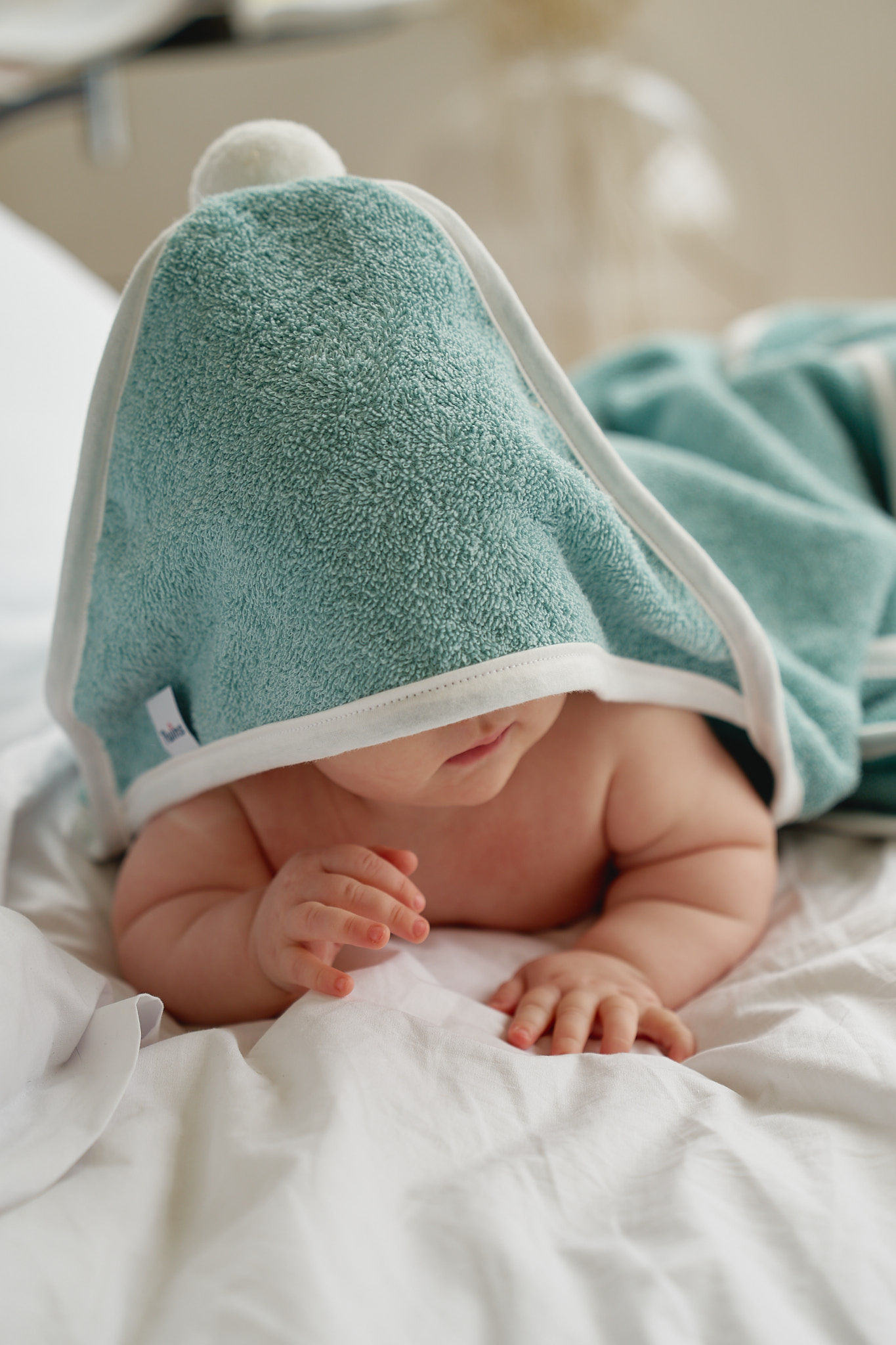 Благодаря удобному капюшону в уголке, полотенце не только эффективно защищает головку от холода, но и создает ощущение уюта после купания.