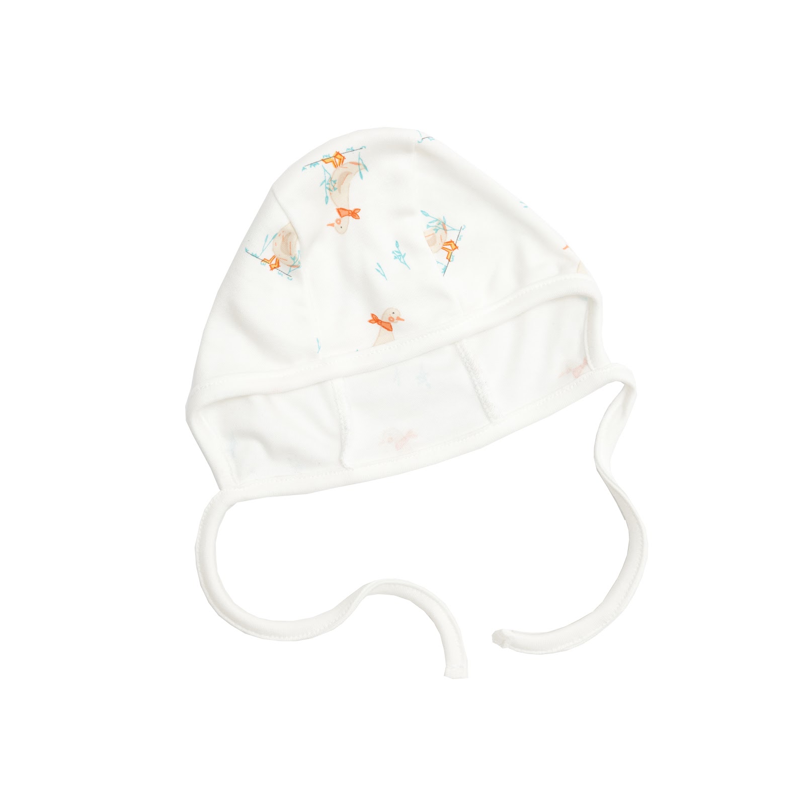 Шапочка имеет внешние швы, которые минимизируют контакт с чувствительной кожей новорожденного, а завязки обеспечивают плотную и удобную фиксацию.