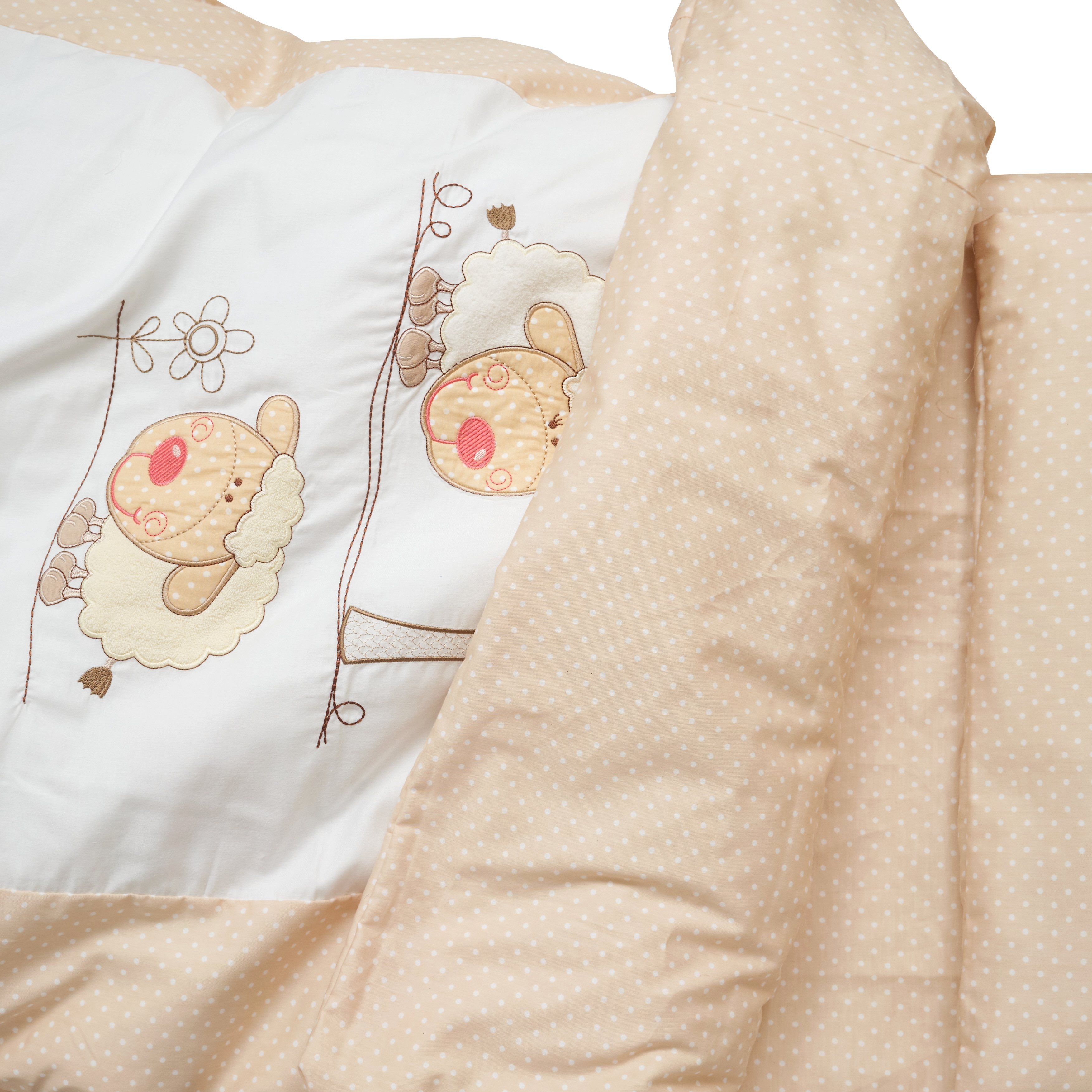 Комплект украшен аккуратной вышивкой в виде мишки, что добавляет уюта и милого вида детской кроватке.
