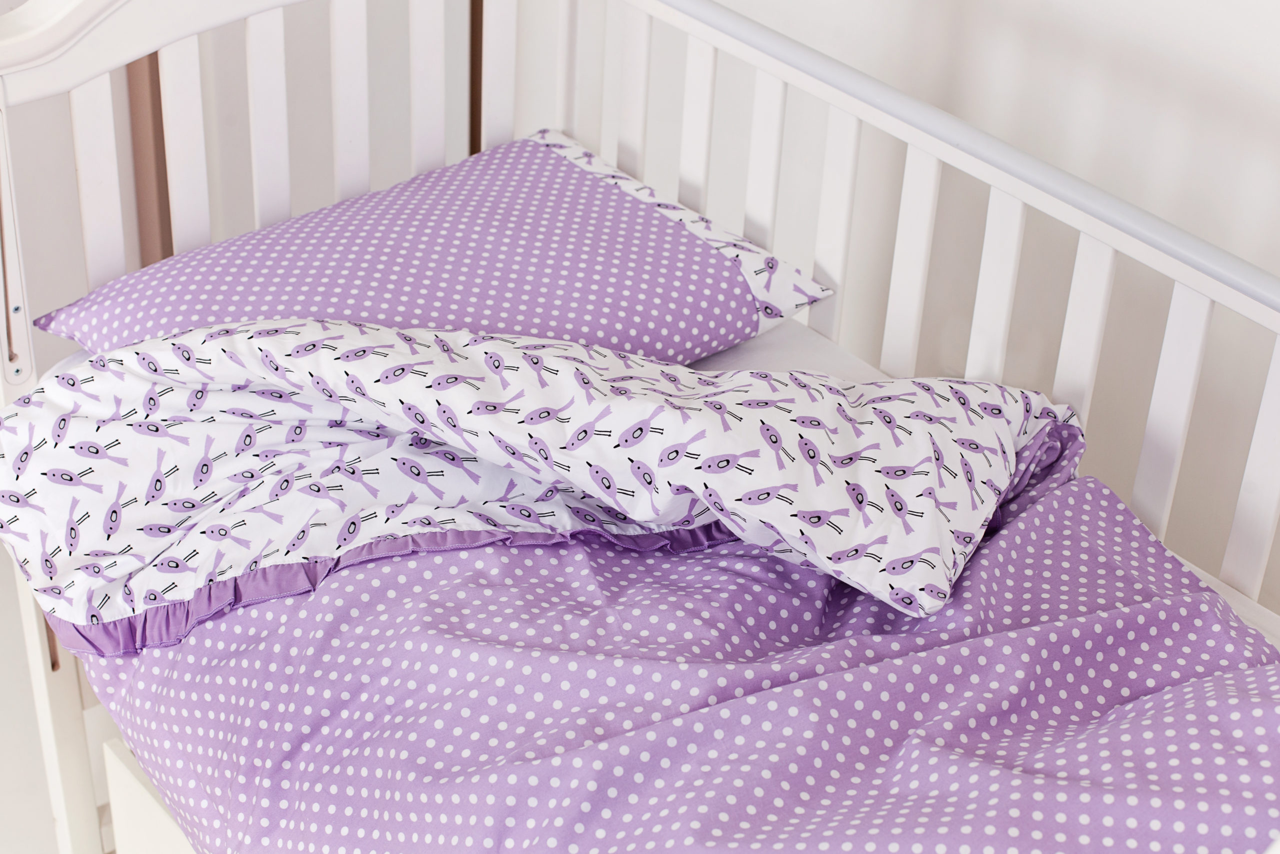 Изделие изготовлено из хлопка высочайшего качества. Дизайн в белом и фиолетовом цветах – проявление простоты, изысканности и совершенства. Его можно брать с собой в путешествие или застилать малышу, пока его основной комплект стирается.