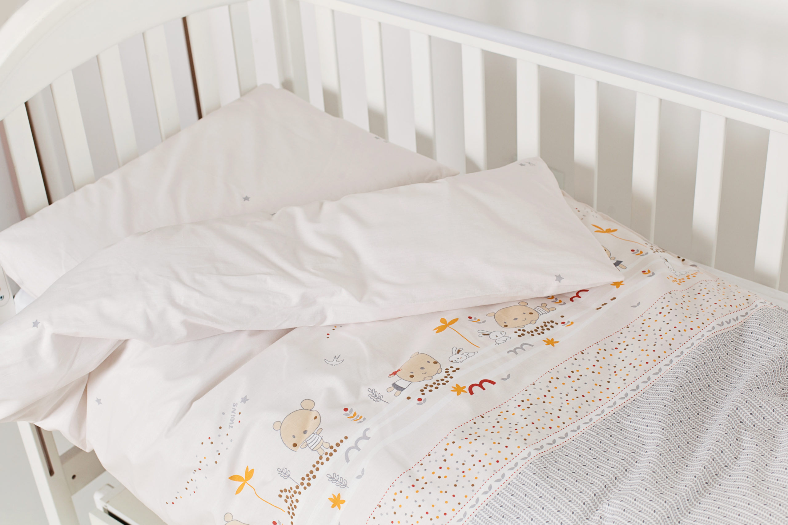 Постель изготовлена из 100% натурального хлопка (миткаль), что обеспечивает высокую воздухопроницаемость и деликатный уход за кожей ребенка.