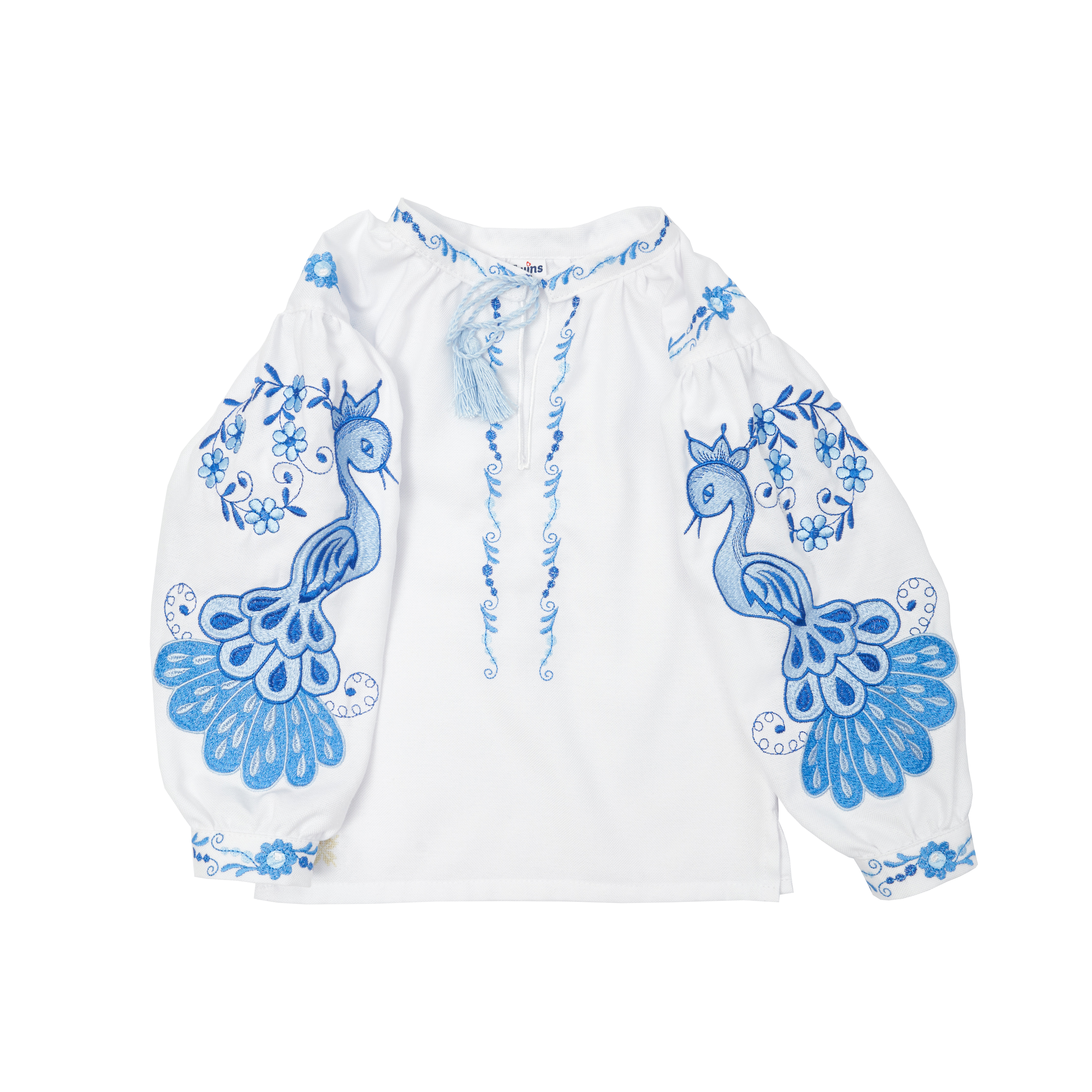 - Орнамент: птицы на рукавах, растительная вышивка на груди, манжетах и воротнике