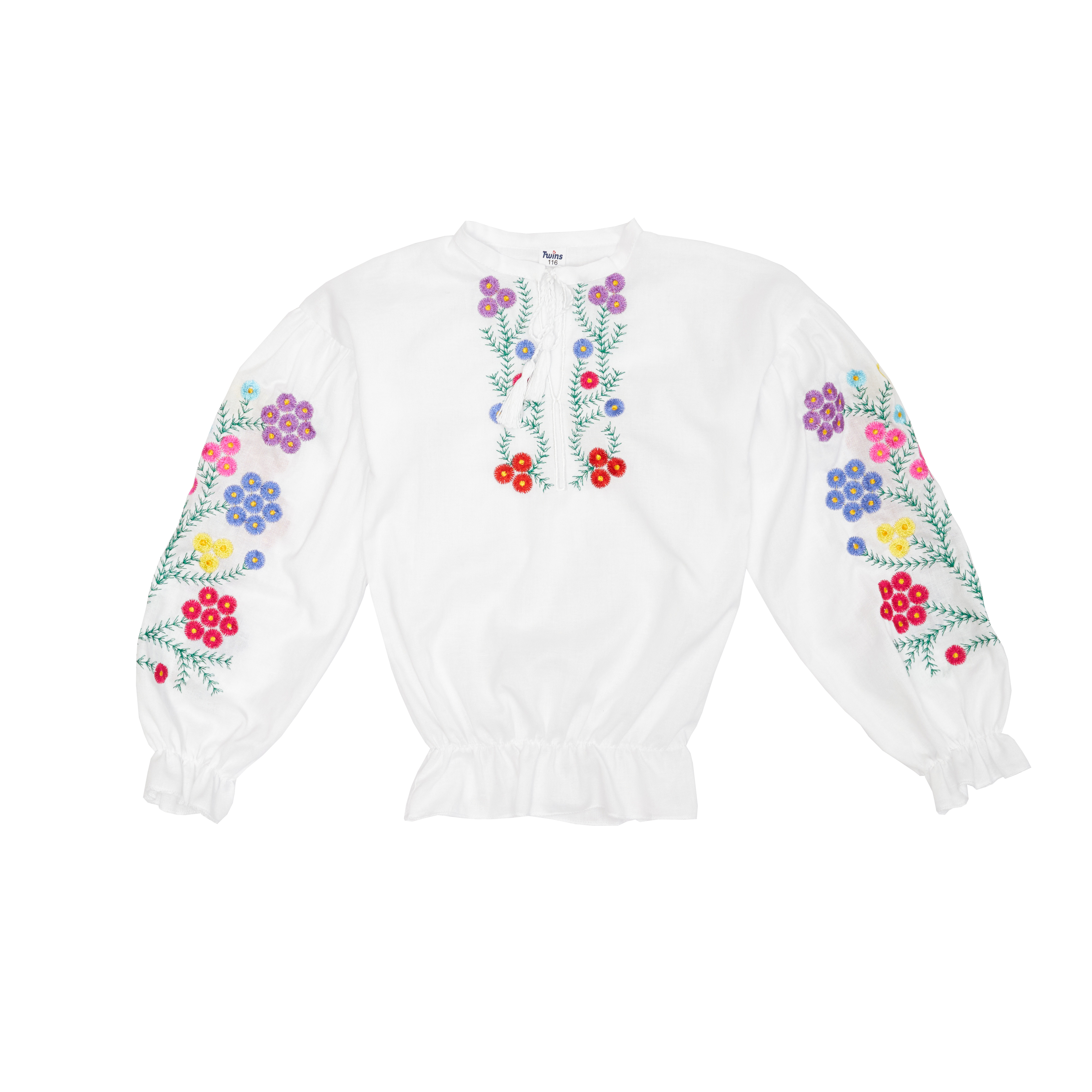 Красочная вышивка цветов на рукавах и груди создает солнечный, праздничный образ, напоминающий первые теплые дни весны.