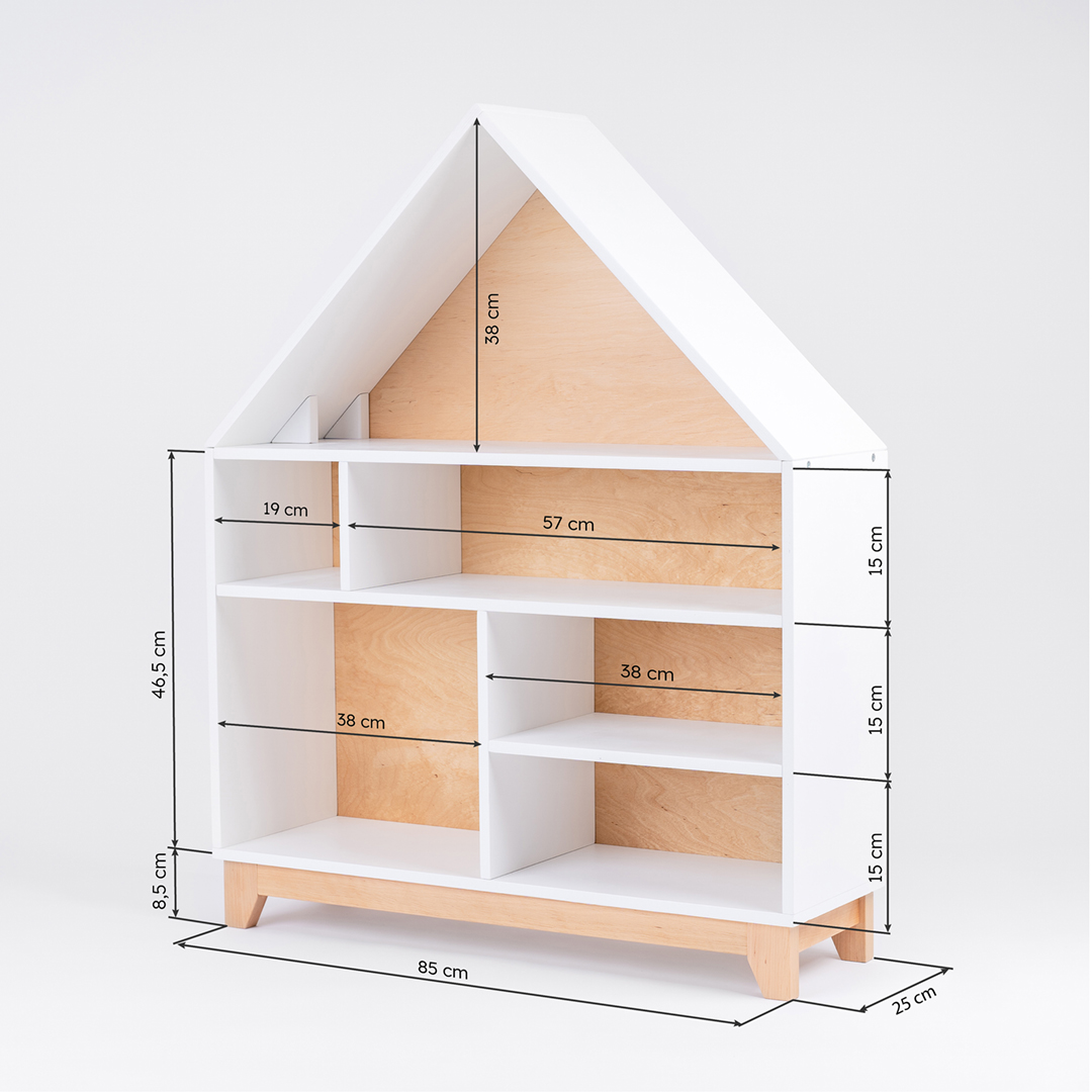 Имеет гибкое использование и доступен даже самому маленькому гостю детской комнаты. Вы можете использовать стеллаж как полку для любимых игрушек, книжный шкаф или как кукольный домик. Благодаря тому, что высота полок регулируется для детей и, таким образом, легко доступна. Домик развивает самостоятельность и пробуждает ребенка решать, с какой игрушкой ему играть. Полка-домик также служит элегантным украшением детской комнаты. Он изготовлен из качественной древесины ольхи, идеально гладкий и обработанный.