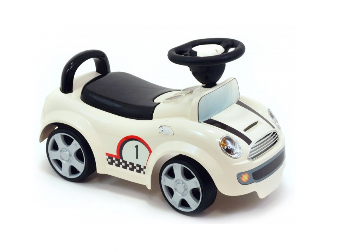 Машинка управляется силой ног ребенка, ребенок отталкивает ноги, автомобиль приходит в движение. В качестве толкателя может использоваться ручка установленная на задней панели. Автомобиль оснащен отсеком для хранения мелких предметов под сиденьем. На рулевом колесе также есть клавиши для освещения и звуковых эффектов.