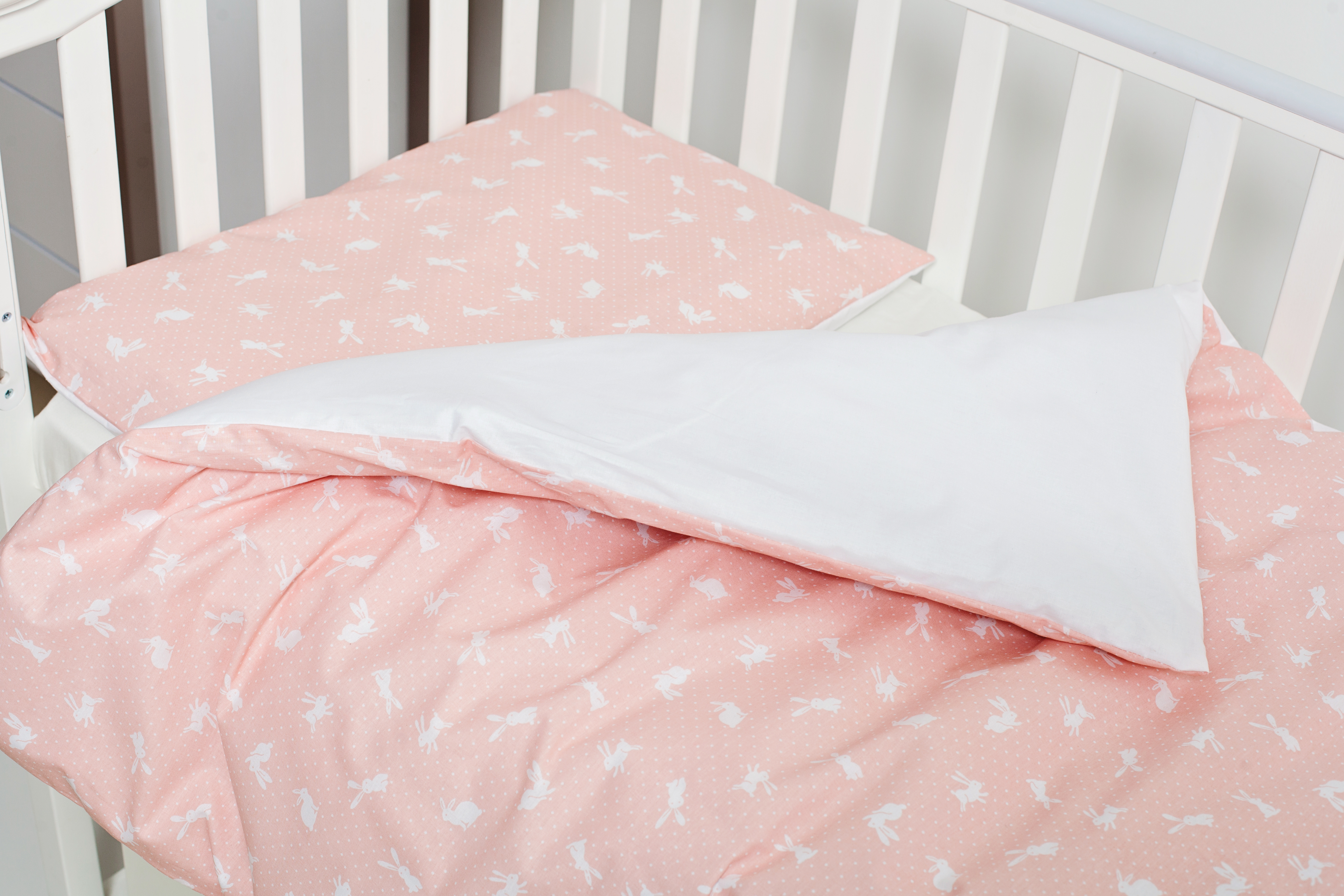 Постель выполнена из принтованной ткани в виде зайчиков.