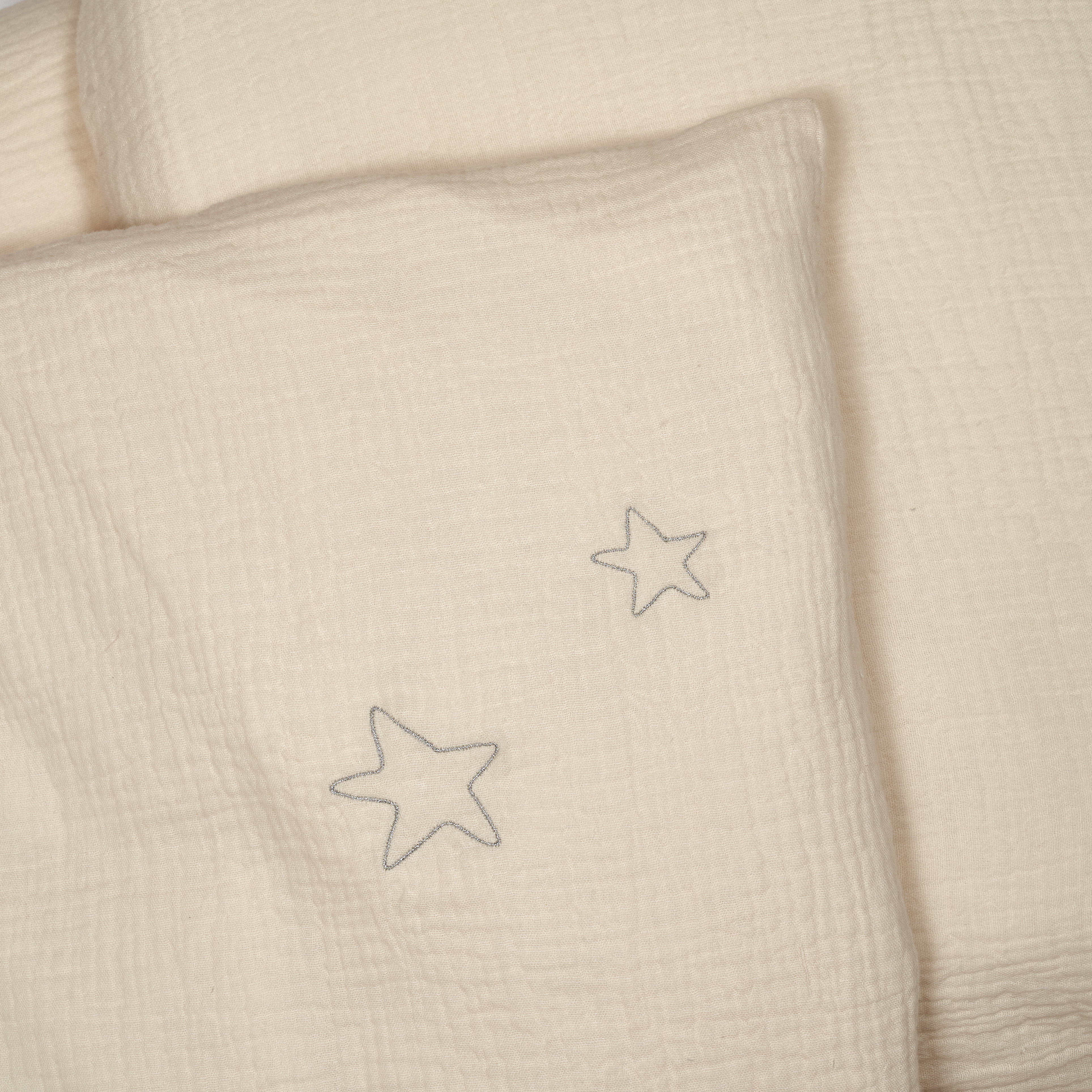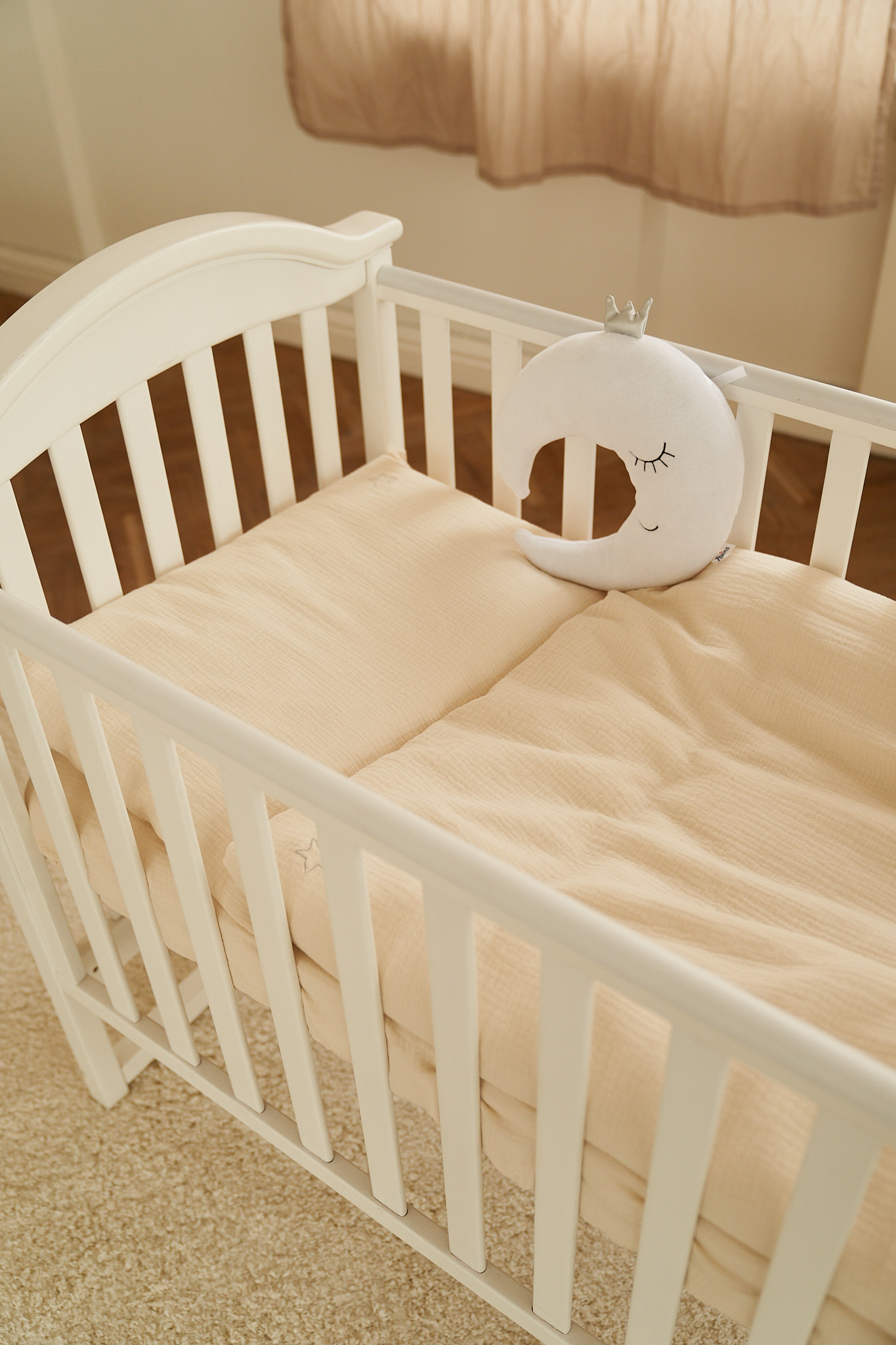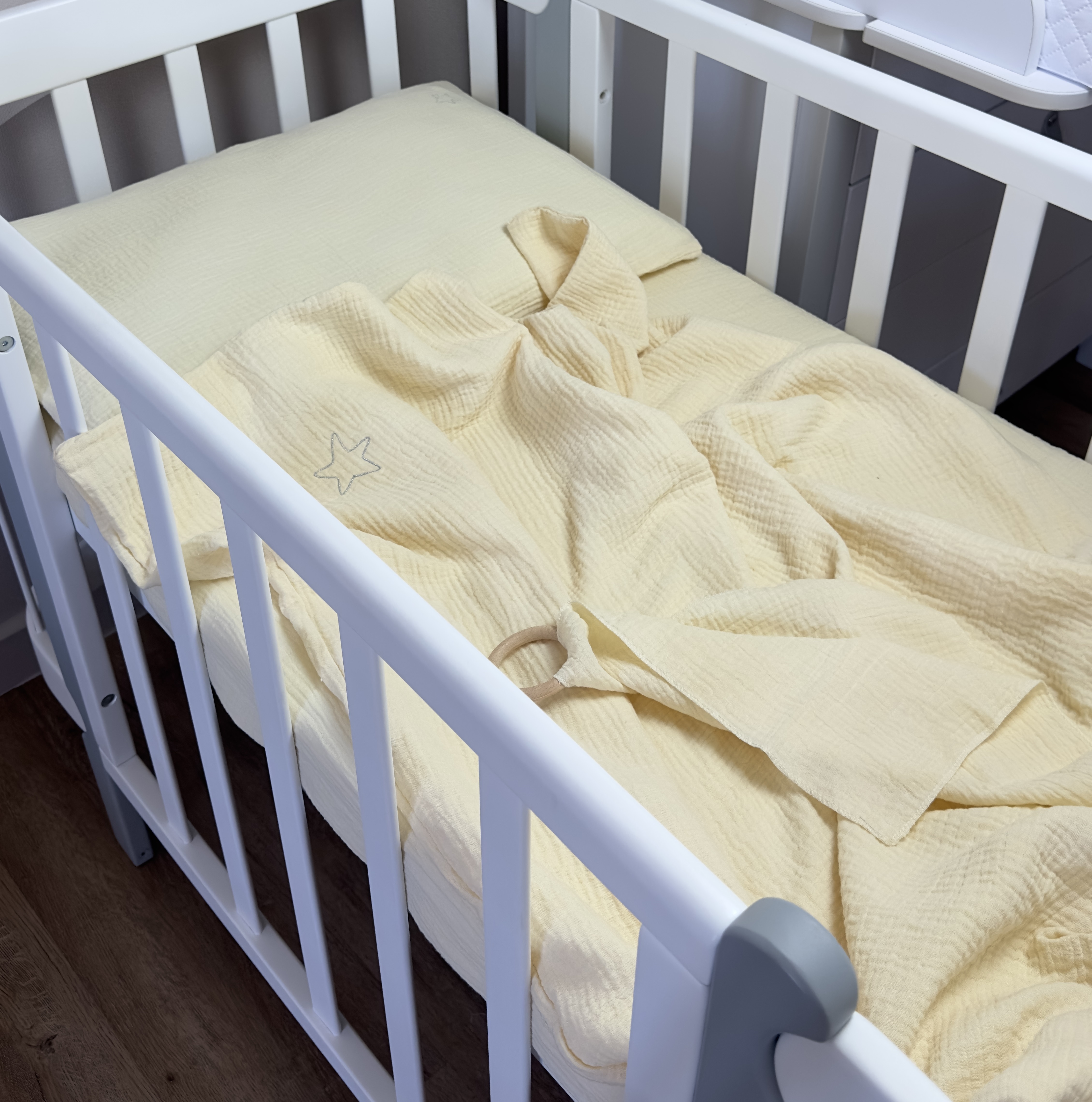 Изготовленное из натурального муслина, это постельное белье сочетает в себе мягкость, воздухопроницаемость и долговечность, что особенно важно для ежедневного использования в детской кроватке.