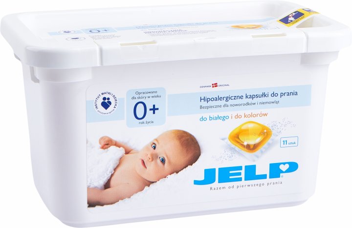 Пральні капсули Jelp пропонують простий і безпечний спосіб прання білого та кольорового дитячого одягу від народження. Ретельне підбирання інгредієнтів і гіпоалергенна формула на основі натурального мила гарантують безпеку чутливої шкіри вашої дитини. Капсули схвалені Інститутом матері та дитини. Вони ефективно видаляють бруд. Підходить для прання всіх тканин (крім вовни та шовку).