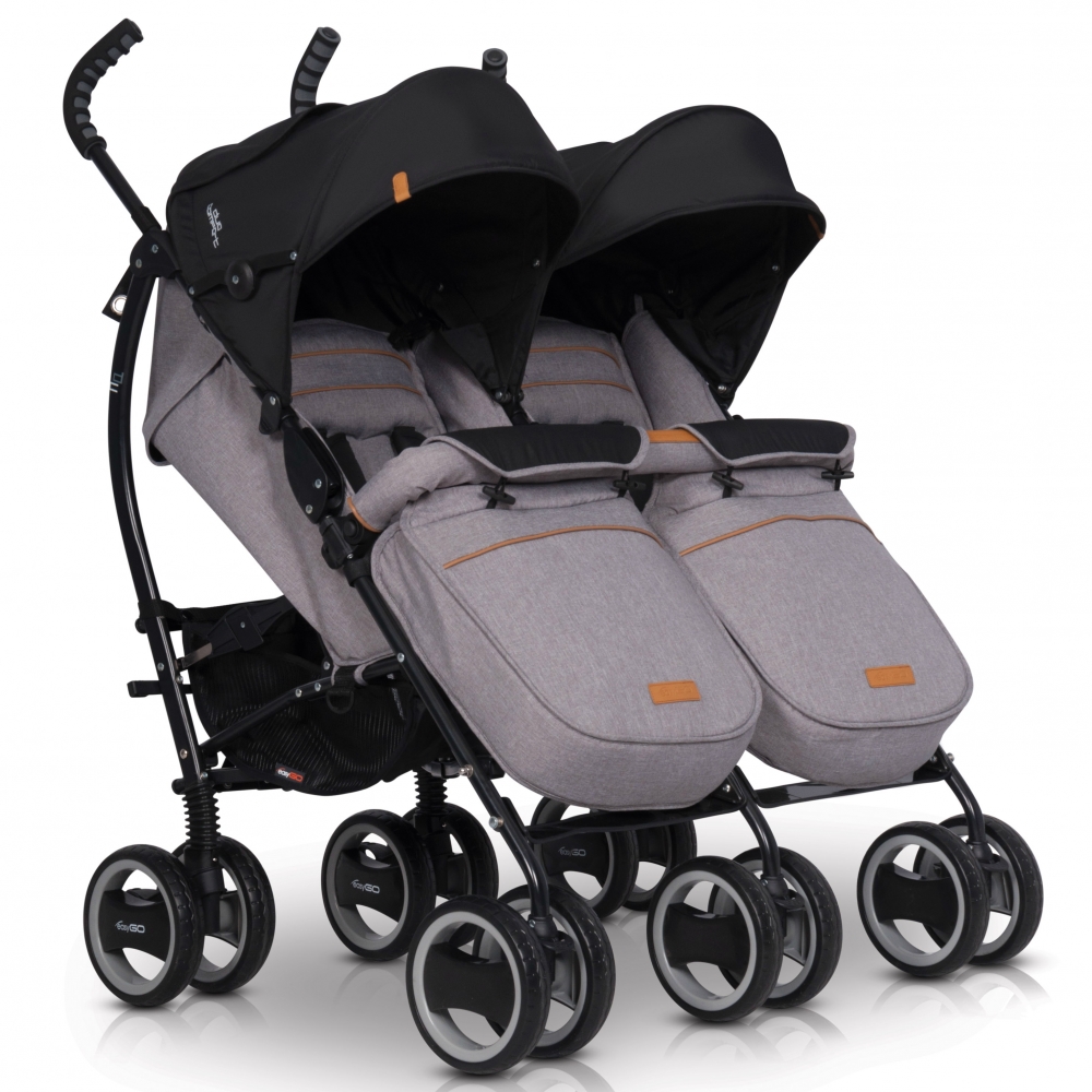Легка і маневрена коляска - тростина для двійні Comfort Duo, оснащена подовженими капюшонами, які захищають дітей від сонця і вітру. Незалежне регулювання спинки і підніжки забезпечують однаковий комфорт малюкам під час денного сну і навіть коли біоритми малюків не збігаються. Коляска також оснащена двома утепленими чохлами на ніжки, дощовиками, має містку корзину і утримувач для пляшечки.