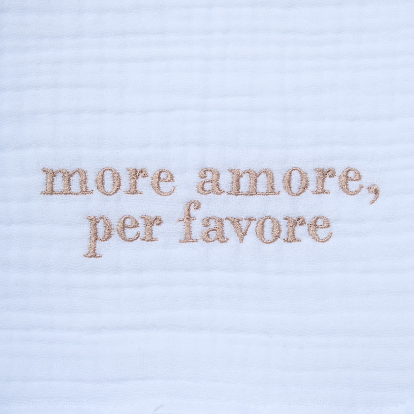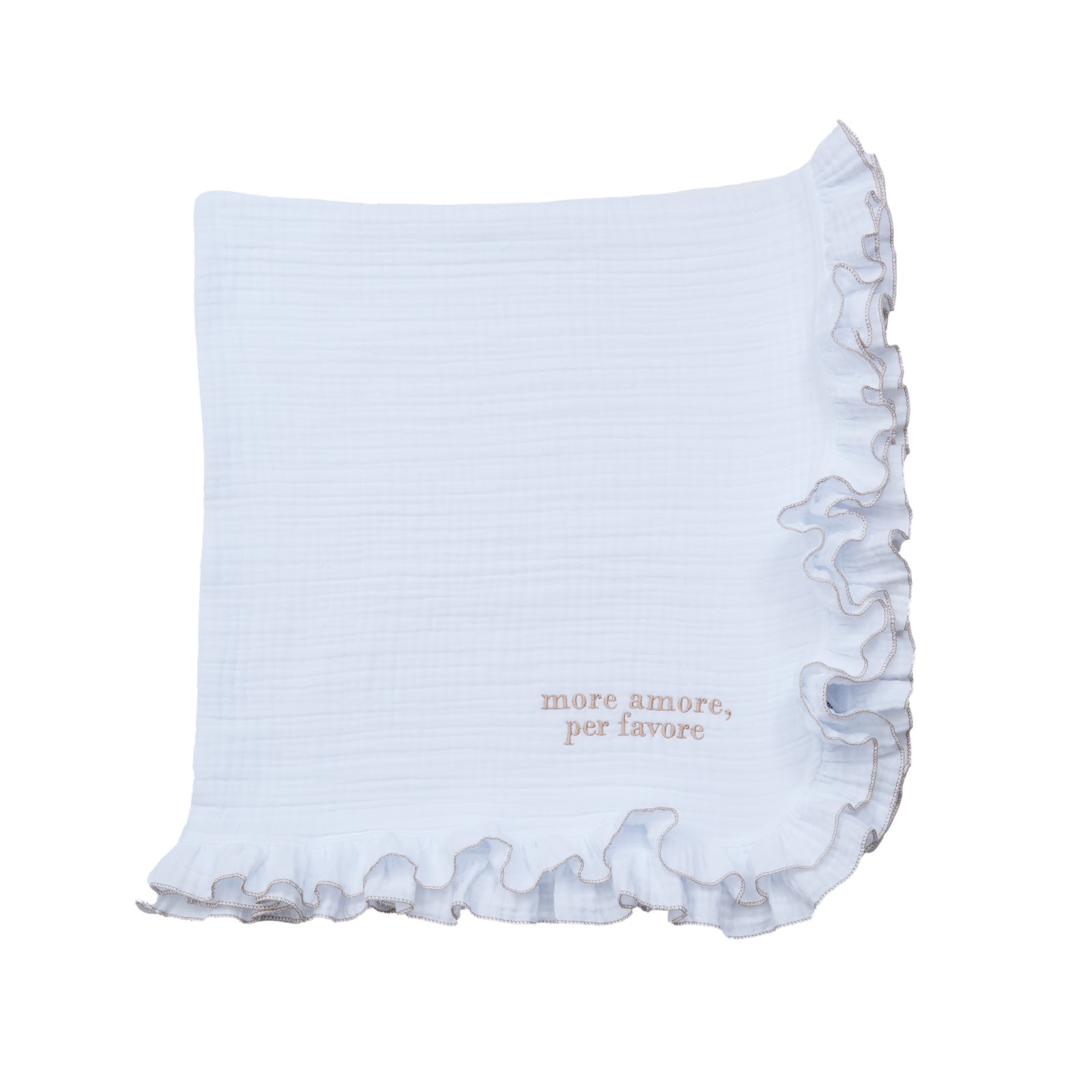 Особливістю пледа є декоративна рюшка по краю та акуратна вишивка «more amore. per favore» збоку пледа, що додає виробу вишуканого та елегантного вигляду.