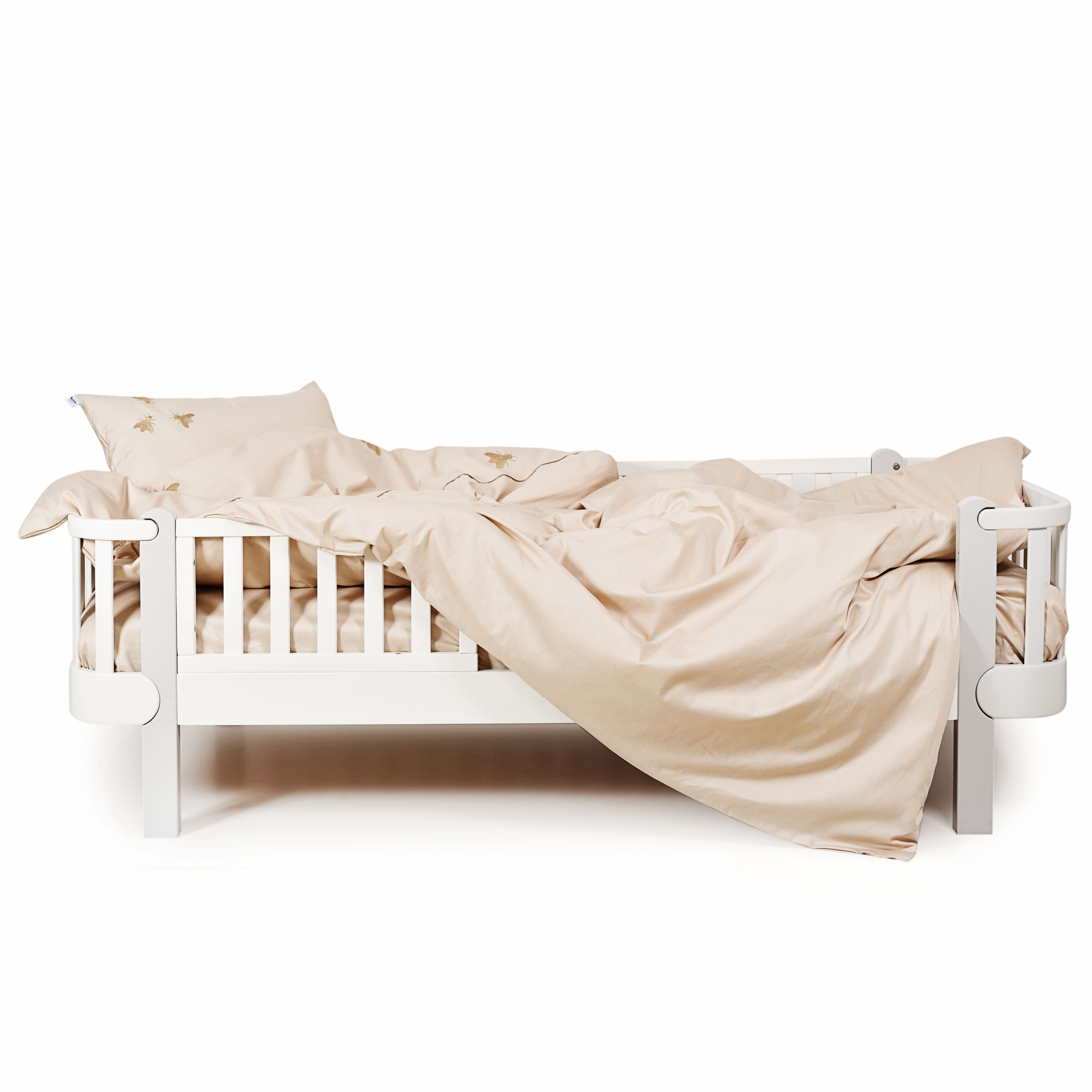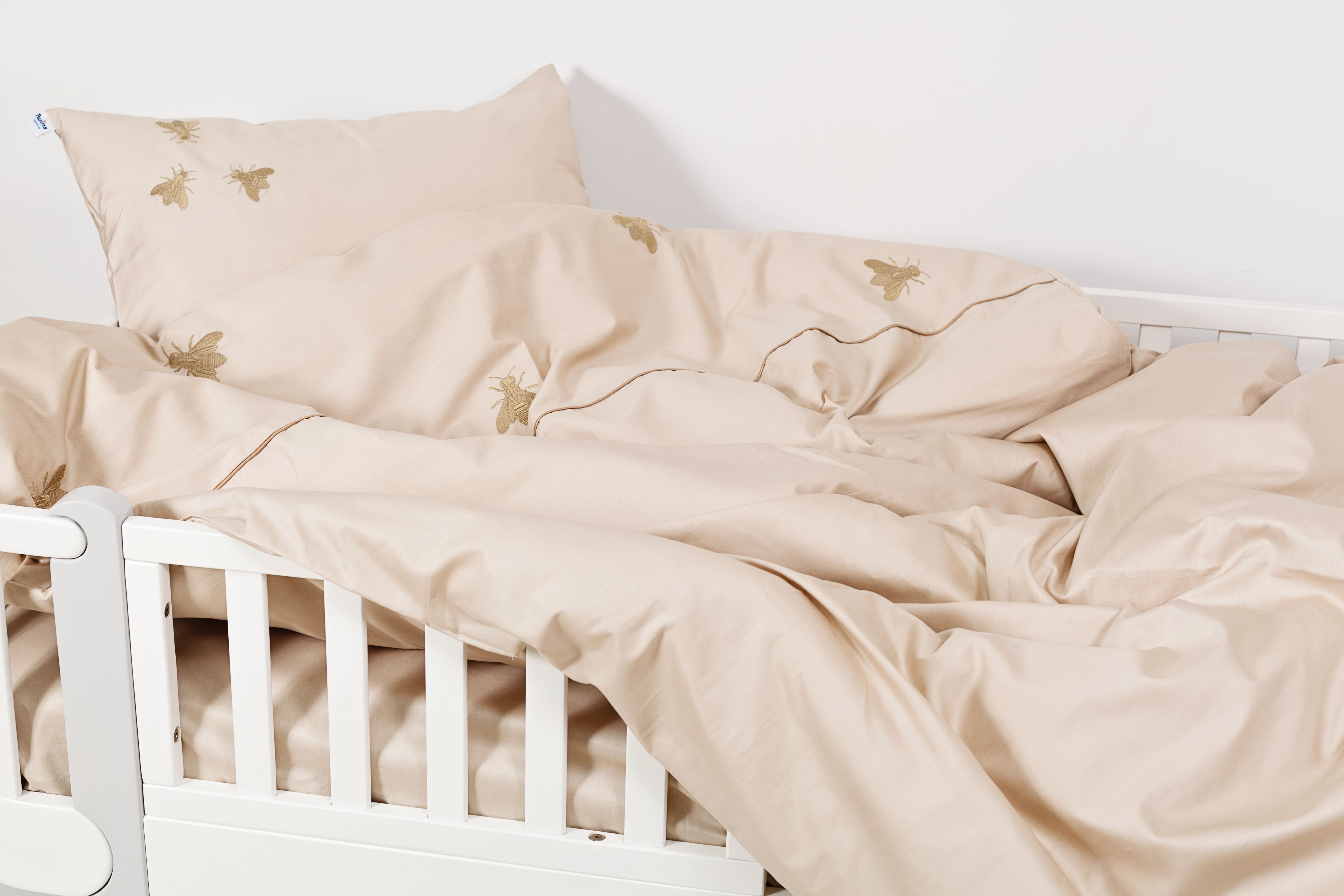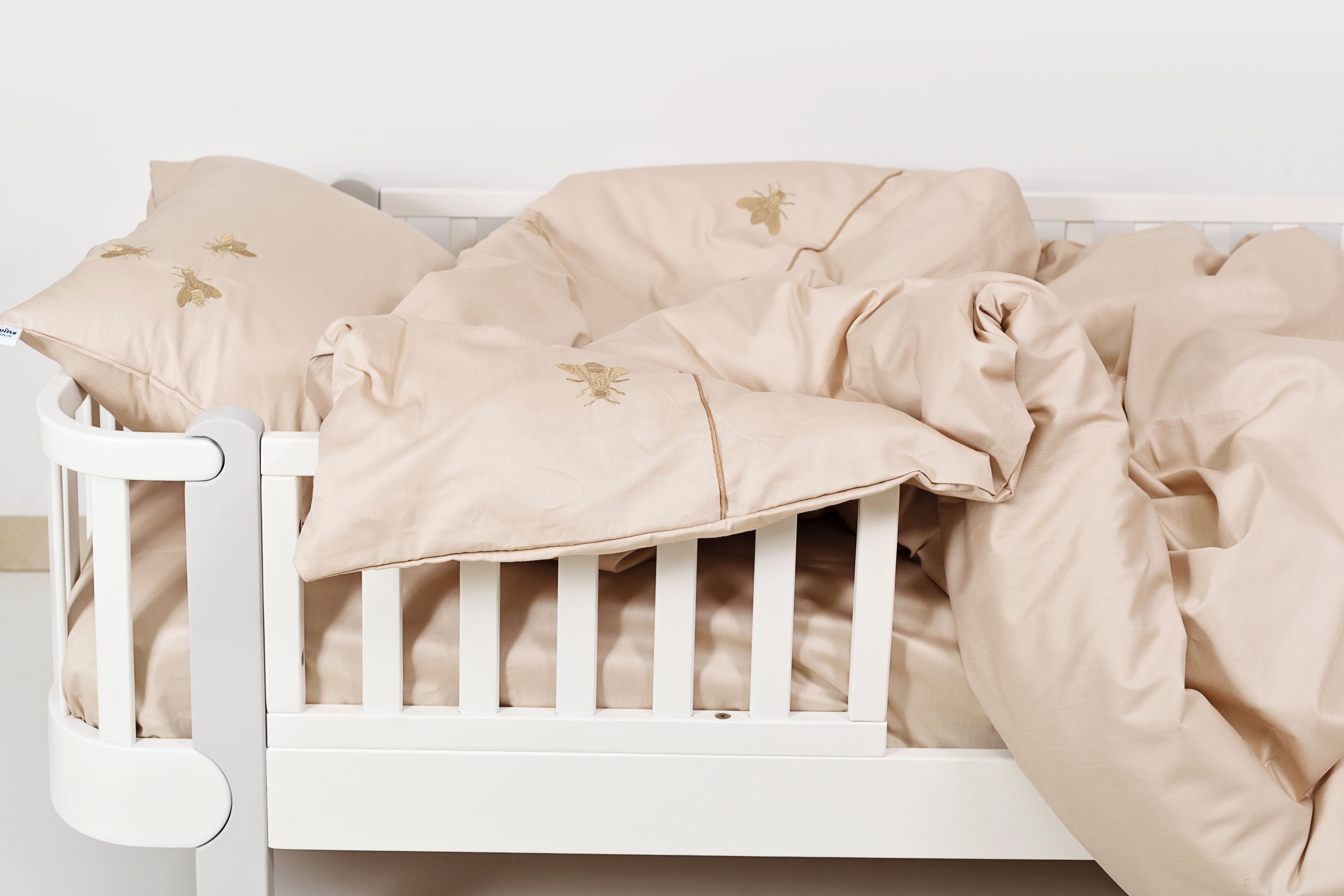 Постіль для дитячого ліжечка від Twins чудовий вибір для першої постелі дитини. Ніжний легкий комплект виготовлений з натуральної бавовни, оздоблений вишивкою у вигляді мух та з кантом в колір вишивки. Приємна на дотик тканина, що поглинає вологу, зносостійка та не викликає алергії.