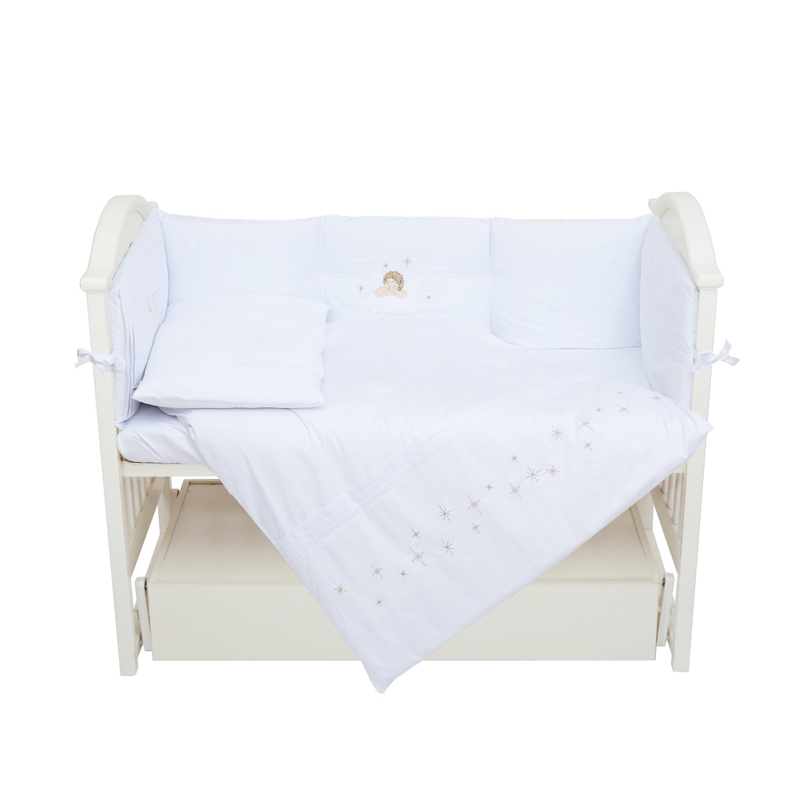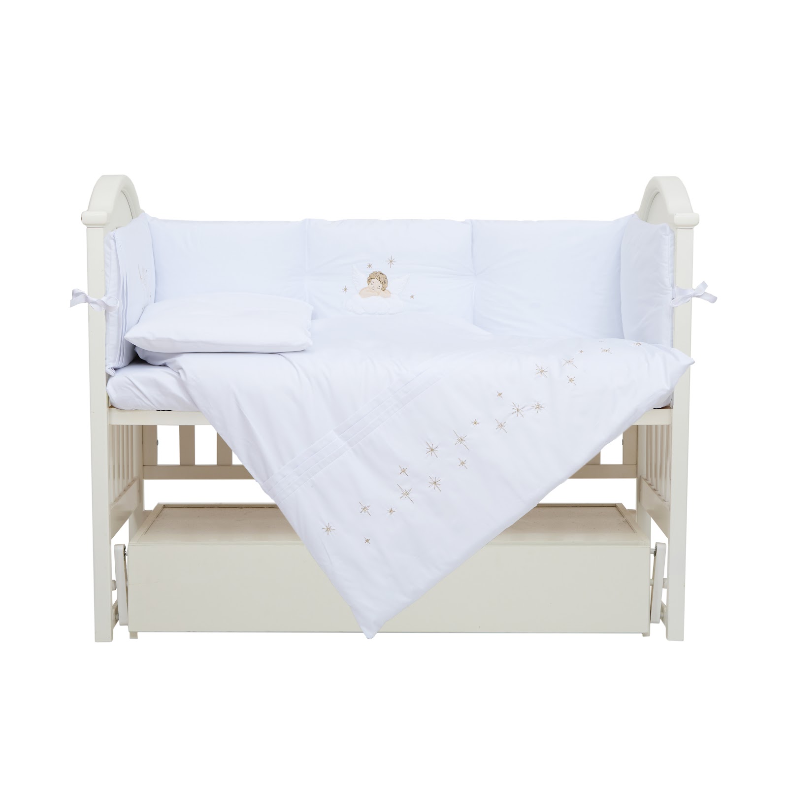 Особливої уваги заслуговує бампер по периметру ліжка з об’ємною аплікацією у вигляді янголів.