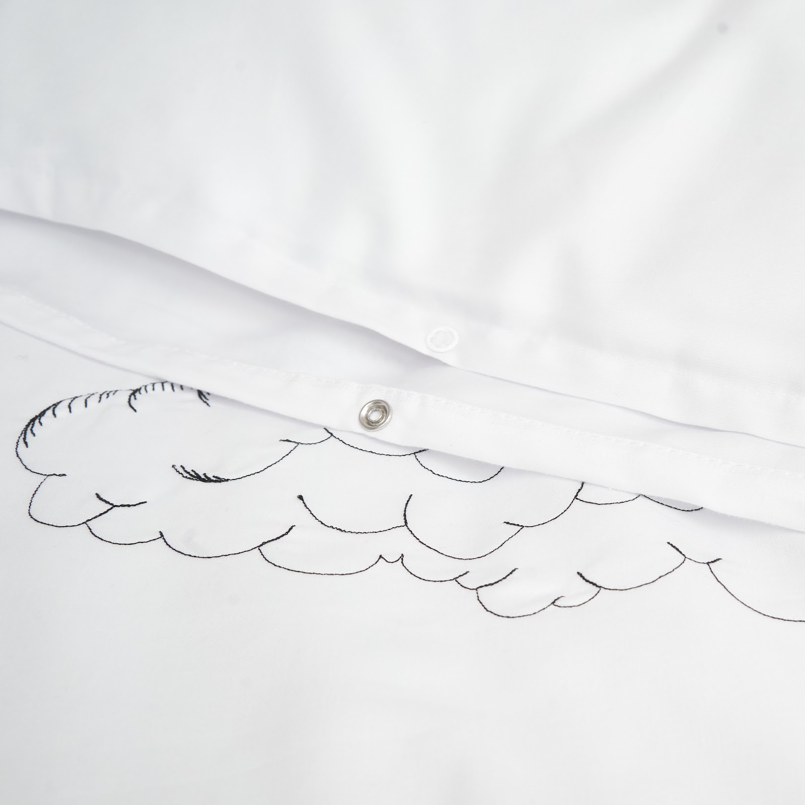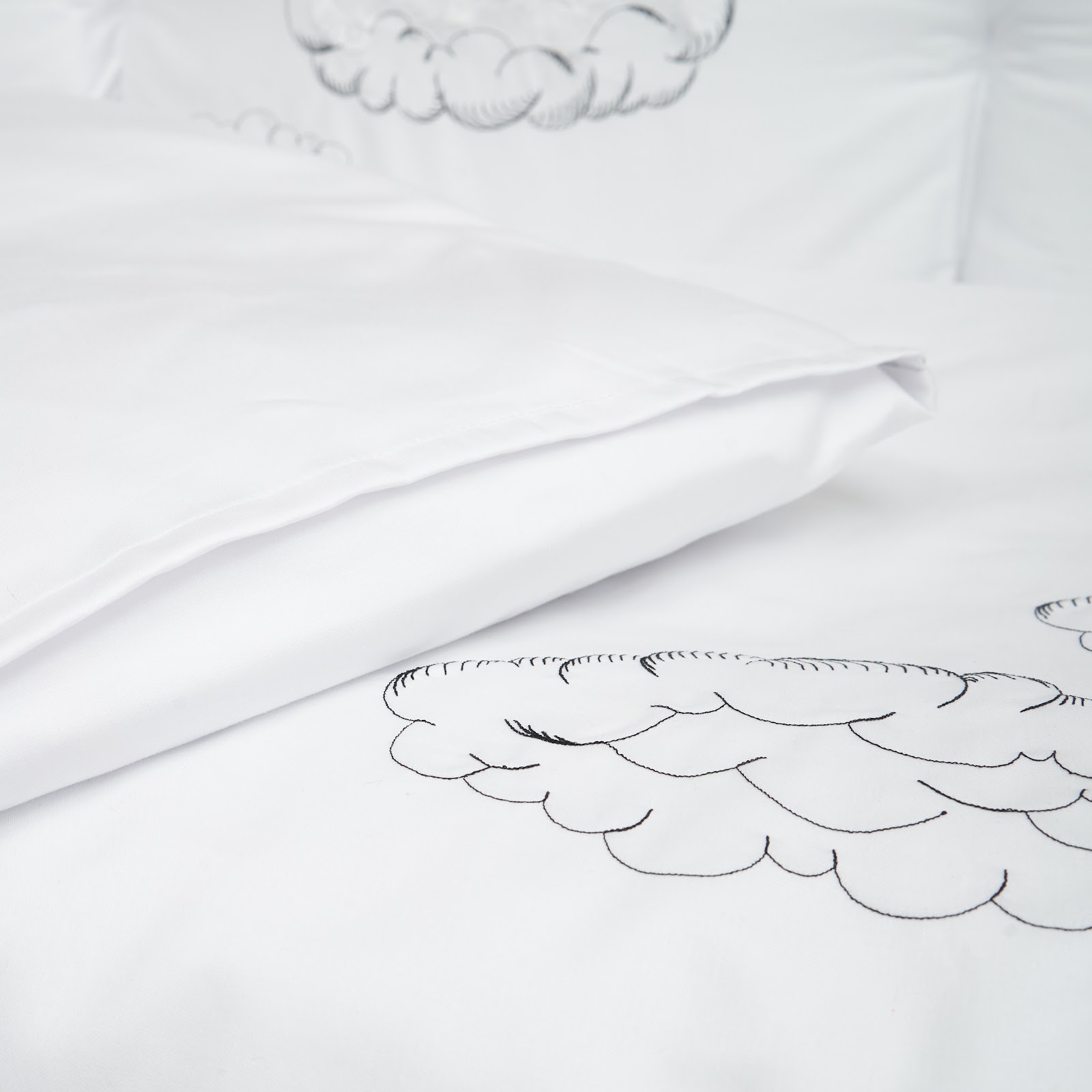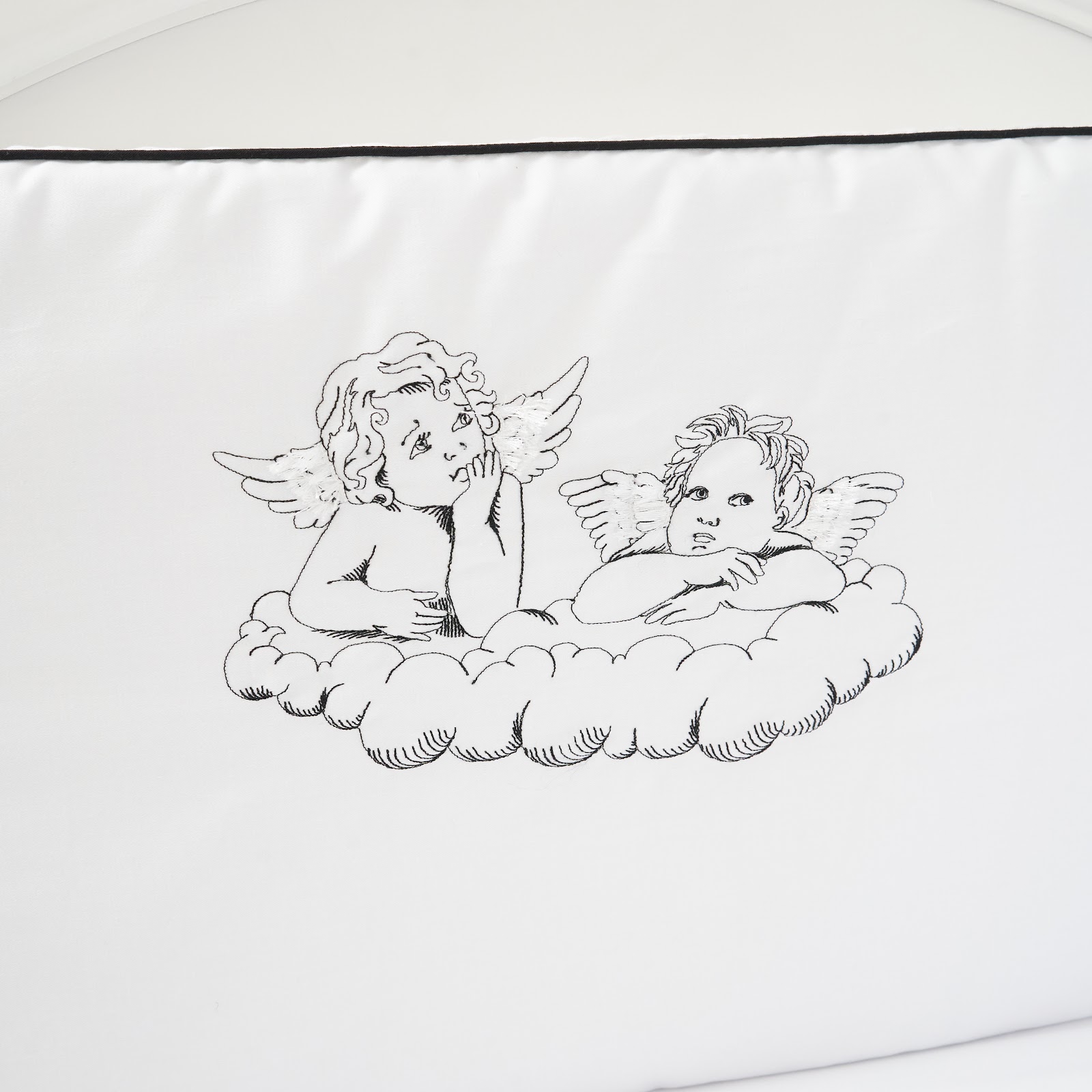 Родзинкою комплекту є вишукане оздоблення вишивкою у вигляді ангелів, що створює особливу атмосферу ніжності та спокою у дитячій кімнаті.