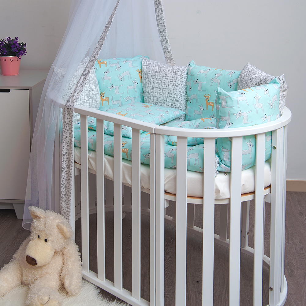 Матеріал основних елементів комплекту - міткаль; балдахін - міткаль і вуаль. Увага! У комплект не входить тримач для балдахіна. Комплект підходить для дитячого ліжечка з розміром спального місця 120 * 60 см, а також дитячих ліжечок круглої конструкції.