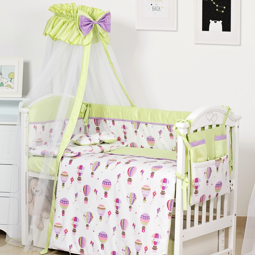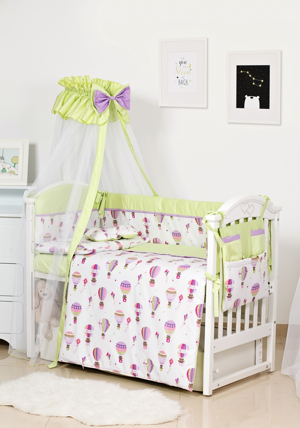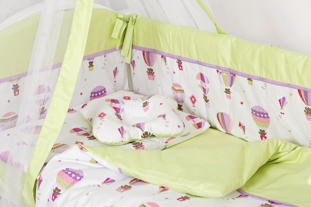 Для ліжечка розміром 120 × 60 см. Наповнювач ковдри і подушки - антиалергенний силікон. Наповнювач бортиків - синтепон. Чохли бортиків на блискавки.