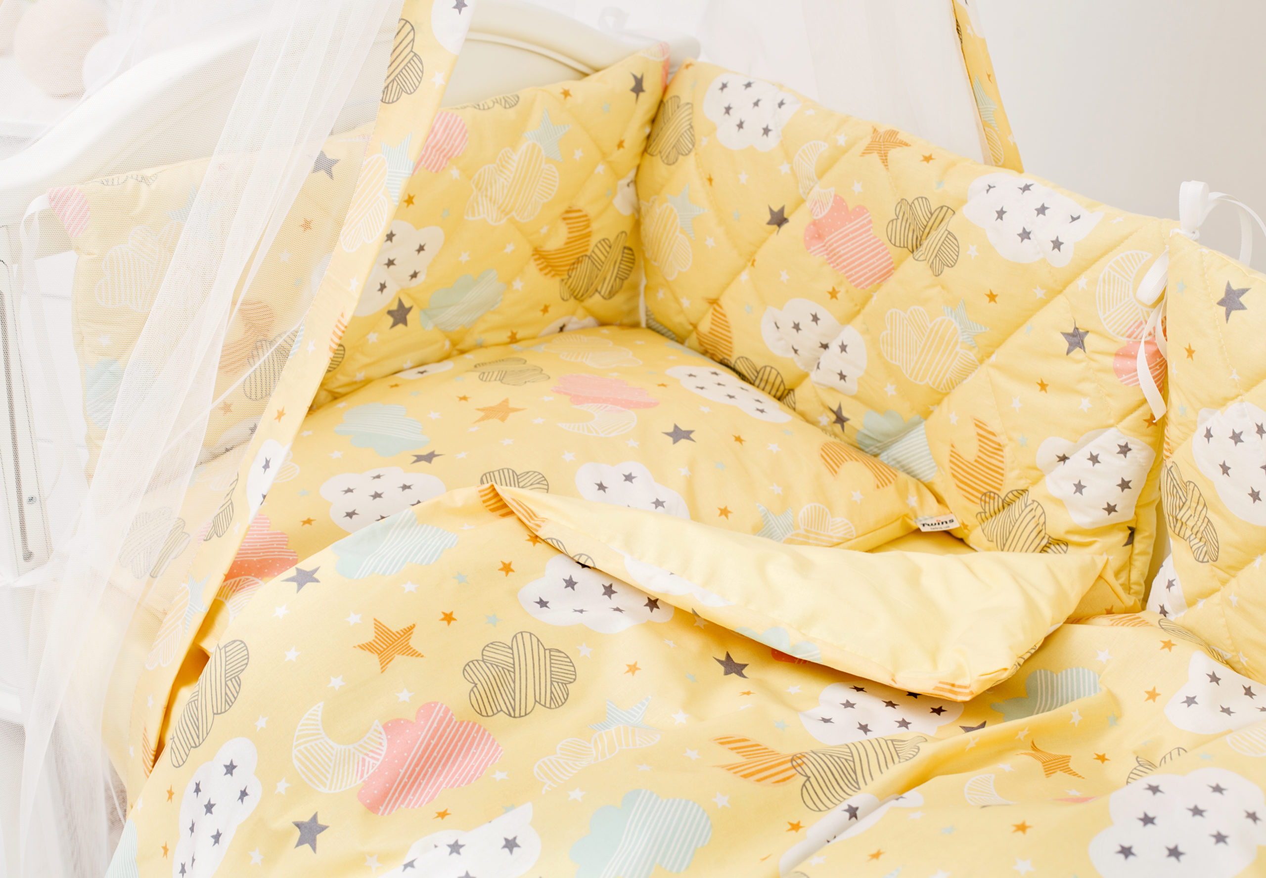 У навісний кишені зручно зберігати необхідні дрібниці, які можуть знадобитися дитині вночі. Двосторонній бампер захищає від прямих протягів, ударів під час сну та ігор в ліжечку. Три зав'язки уздовж бампера дозволяють прив'язувати іграшки з музичного мобіля, доповнюючи при цьому комплект яскравими елементами і розважаючи малюка. Борти стьобані без замка.