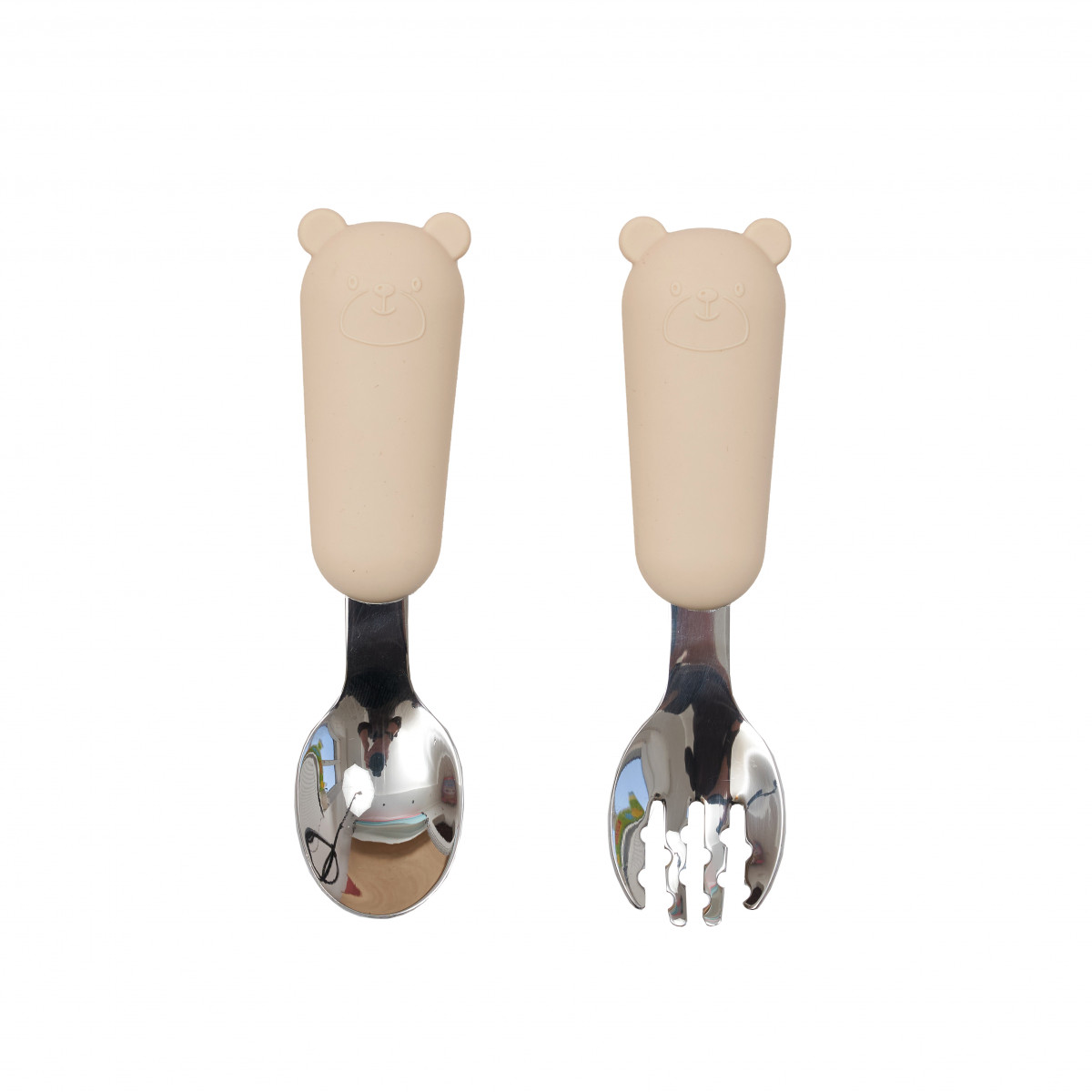 Прибори - ложка і виделка з нержавіючої сталі. Приємні на дотик та безпечні для малюків, форма зручна для обхвату дитячою ручкою.