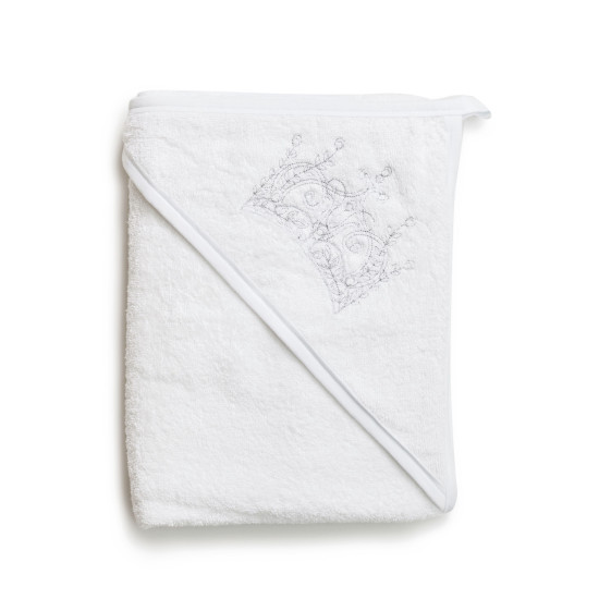 Завдяки капюшону з красивою срібною вишивкою у вигляді корони, рушник не лише захищає голівку дитини від протягів, а й додає виробу витонченого вигляду.