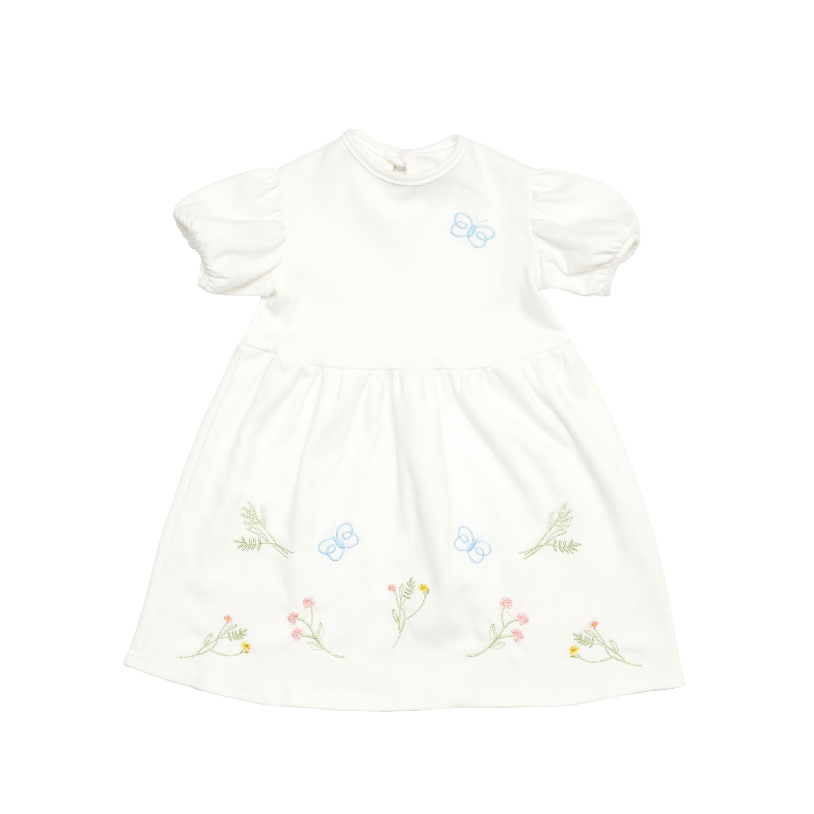 Короткі рукави з м’якою резинкою не тиснуть і додають образу легкості, а декоративна вишивка у вигляді рослинок та метеликів створює атмосферу казки та весняної ніжності.