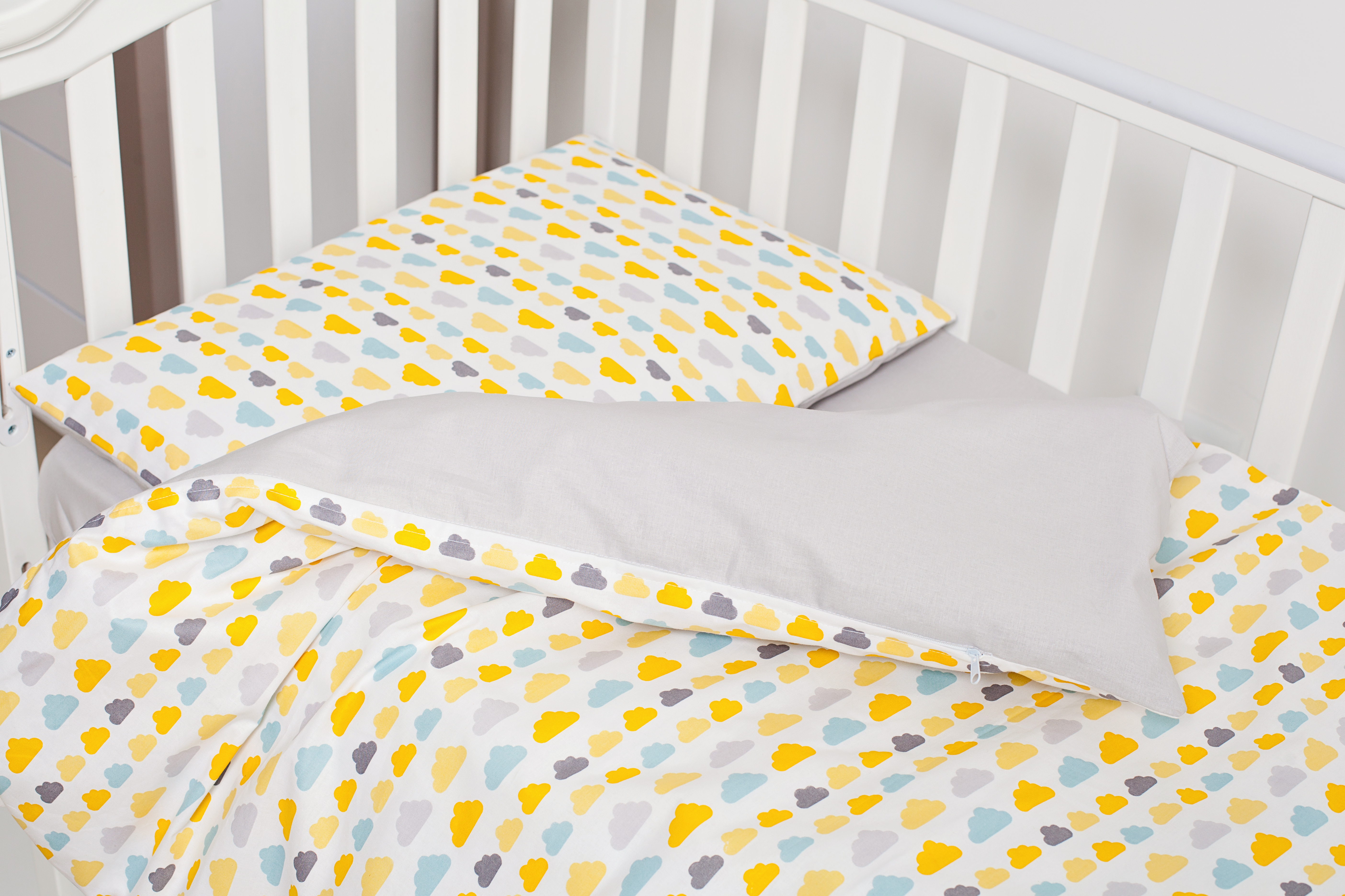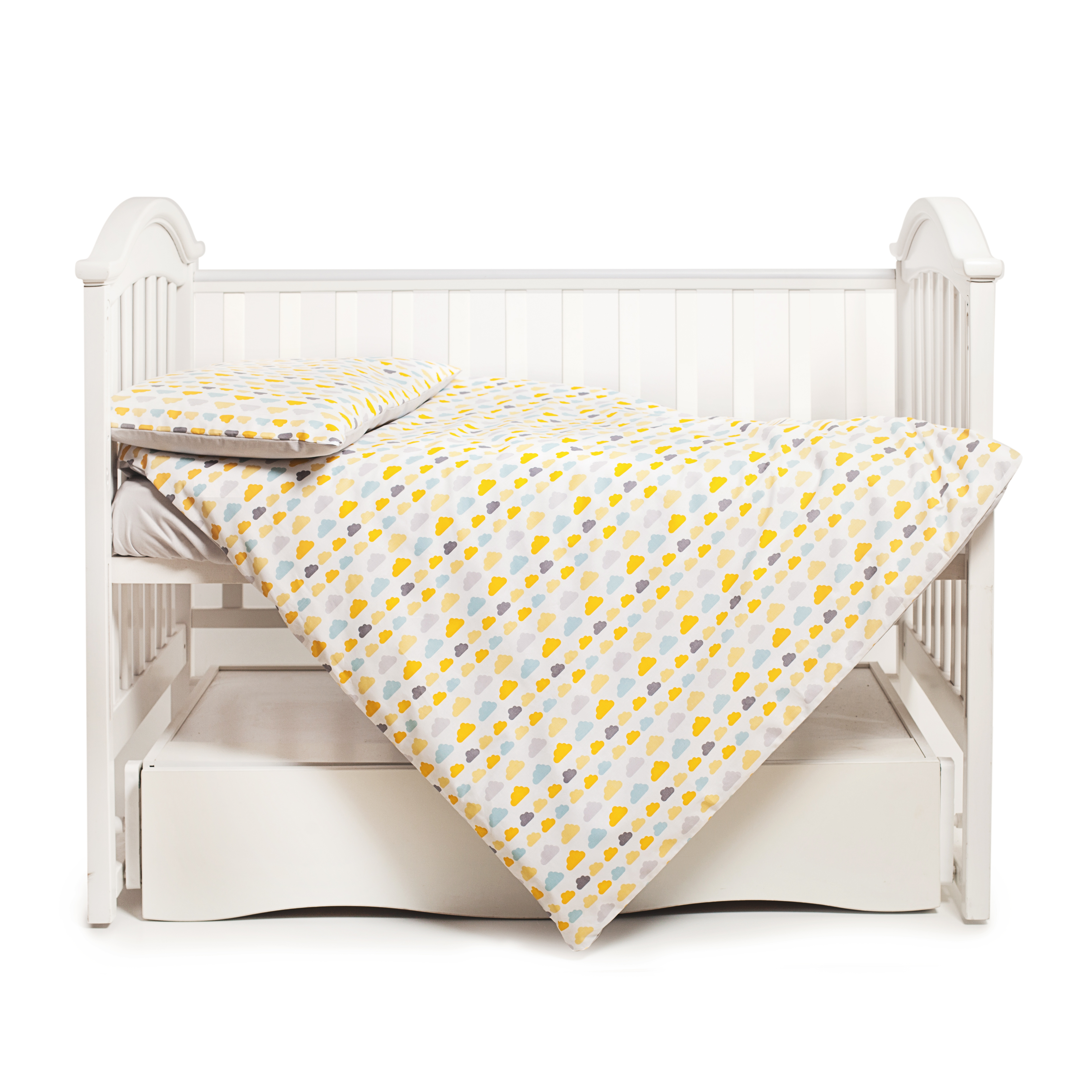Постіль виконана з принтованої тканини у вигляді хмаринок.